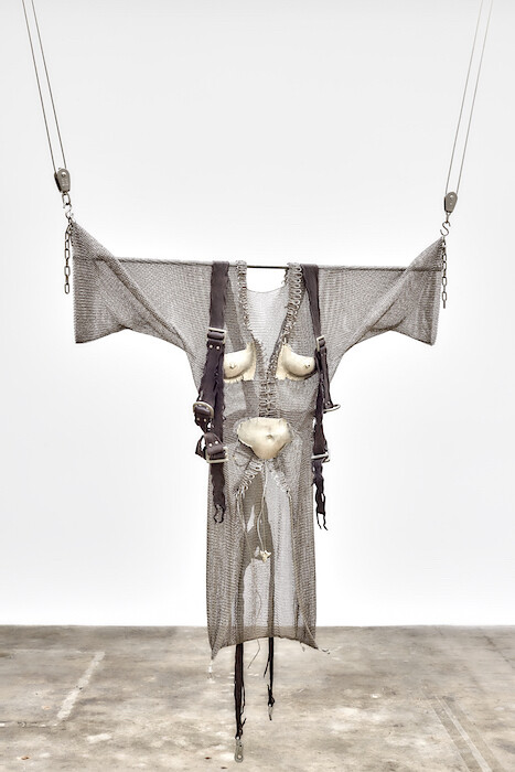 Nearby, cast pewter breasts and belly dangle from the fine mesh of a long-sleeved chainmail hauberk, shouldered with leather harnesses, a long, thin metal tube spreading the arms in prayer or supplication, all hanging in the air with industrial pulleys anchoring it to the hard cement floor with a cinched sandbag. The scenography of the last bit makes it feel like a prop in some lost play by H. P. Lovecraft costumed and propped by H. R. Giger. A sinister future or distant present, the clandestine fetishes hidden in the dungeon of our collective psyche. A fucking awesome costume to a really sick goth party.