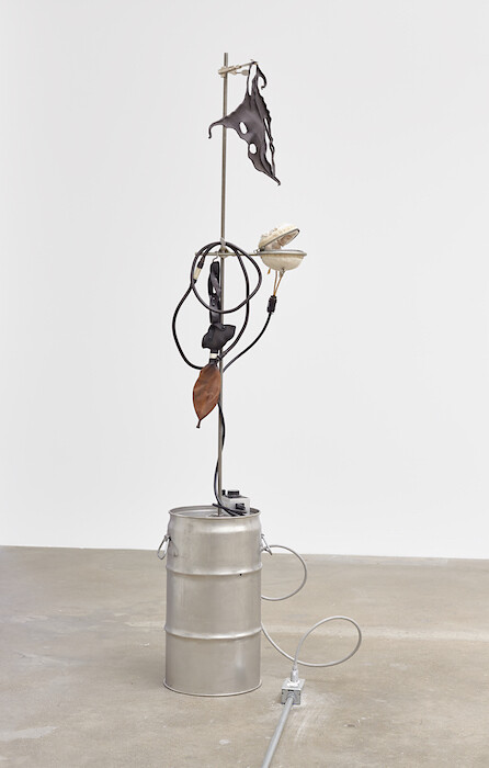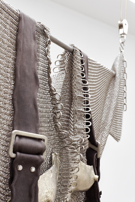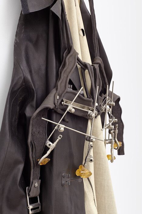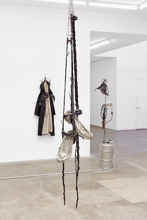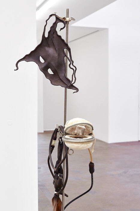 The artist lends her voice to the curious titles of these works—the hauberk’s named dressing for altitude (2017)—but even more so to a statement that accompanies the show and reads like a garbled transmission of a technocratic dictator’s last love poem delivered from a bunker at the end of the world: “Everything has a predilection for want to exist by strict structural rules consisting of temporary gridbondages loosely tethered to memory jacketing. When there is a displacement on the soft boundary of, then these bonds is broken a wave of oscillations begins to move along the question which rips free.” The jangle of word and emotion, neologisms and redactions, sensuality and mystery mirrors the unusual assembly of objects and sensation in the artist’s sculptures. Something both erotic and scientific. A rubber jacket, titled FOR MAKE ADMIT THIS VOIDE (2017), includes in its list of materials “orthopedic jaw fixation hardware” and amber. The work emanating labdanum with its heating element, standing on a metal pole, includes a high-altitude flight mask and, rippling above it like a flag, a black mask, shaped so that it looks so much more fluid than its stiff material actually allows. Its lengthy title, cut in part from the artist’s statement, reads like its own darkling poem: Who are what looks out from behind you are is the thing that names what transforms…now, look what calms the captive by letting him sniff the perfume, like smell what smells like your masters crotch (2017). The coded words have a texture, a Baudelairean lexicon. The last phrase, “your masters crotch,” feels like a dom’s command just as they cinch the last knot of your bondage.