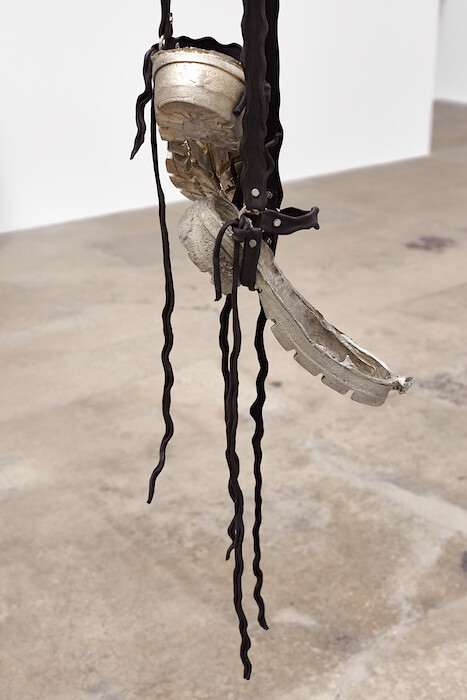Hanging from a steel chain and leather straps, the bottoms of two boots cast in pewter bear the imprint of an absent foot impressed into the metal, in wave form walks the earth (2017). The sheen of the metal, the dangle of the straps, the ghosted body becomes a wave form, the earth more than just terra firma, but an atmosphere, walking it like a sound carried in the air. The sculpture embodies a cryptic poem like a science experiment in aesthetics.