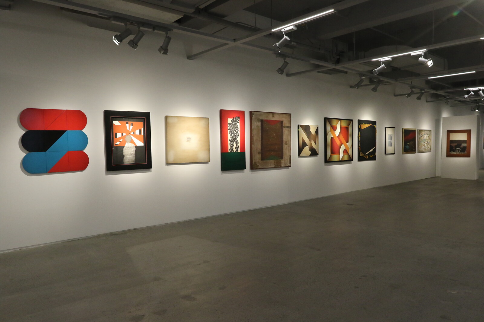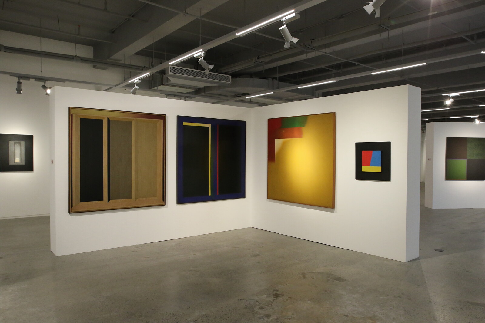 The dense hang of “Elusive Edge,” which features more than sixty artists and eighty works, foregrounds differences in the works’ stylistic intentions while allowing points of commonality to emerge. Grids and frames within frames—which characterize, for example, a group of paintings from the 1970s by Benedicto Cabrera, Gus Albor, and Santiago Bose—are common tendencies throughout. The density and immediate visual kinship of this grouping is brought into relief by Lani Maestro’s 1981 series of spare watercolor-and-pencil works on paper. Displayed on a wall in the middle of the central gallery in stainless steel and white frames, Maestro’s sleet-gray surfaces, with sheer smudges of graphite, resemble curtains of rain through gusts of wind, and starkly contrast with the intense colors and severe edges of paintings elsewhere in the space. Totemic metal and wood sculptures from different periods in Arturo Luz’s practice (the 1970s and 2010s, respectively) punctuate other areas to similar effect.