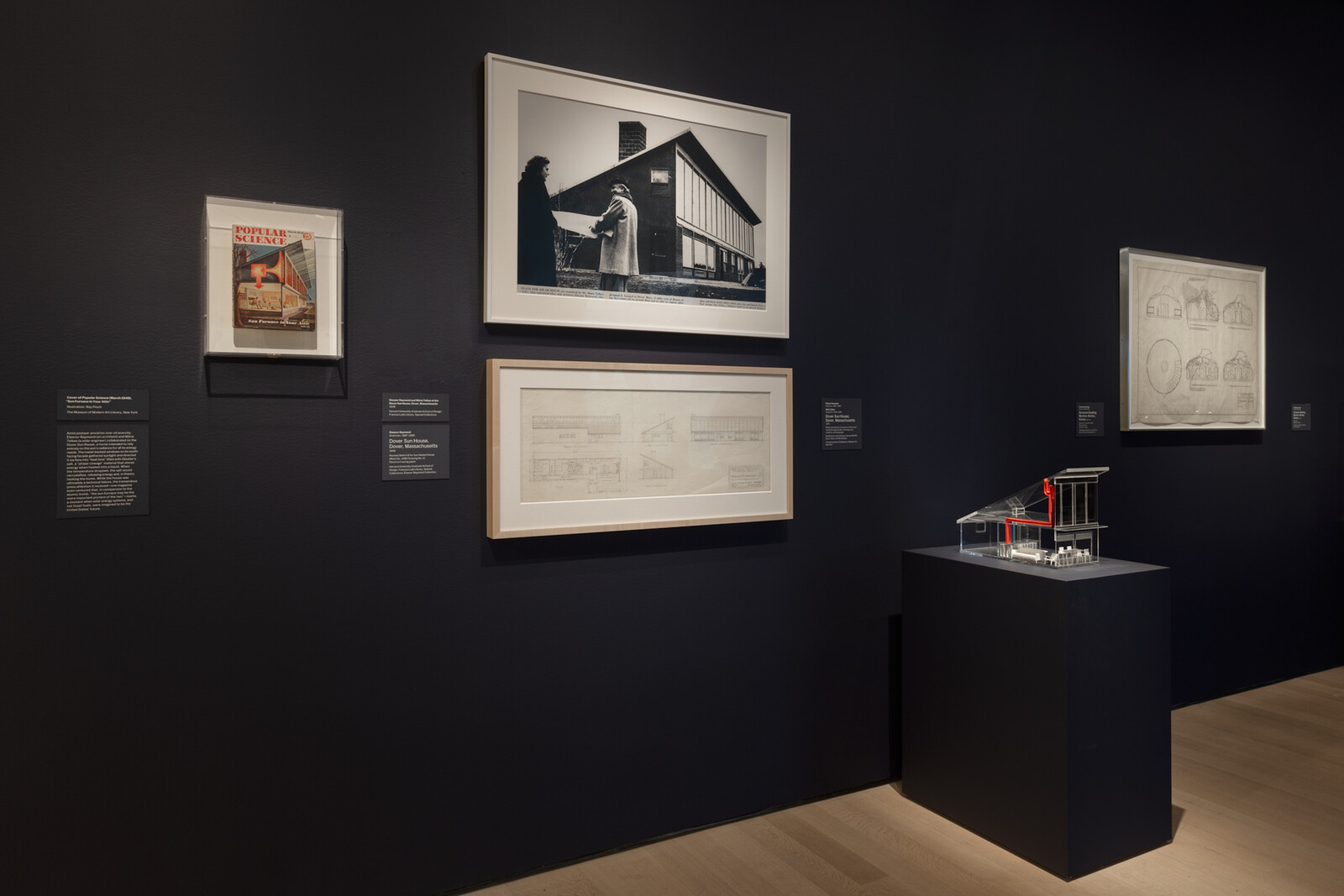 In March 1949, the cover of Popular Science magazine featured Ray Pioch’s brightly colored drawing of architect Eleanor Raymond’s Dover Sun House, a Massachusetts home developed with solar engineer Maria Telkes and heated exclusively by solar energy. Part Rockwell painting, part architectural section, and part science diagram, the illustration drew on Pioch’s experience drawing instruction manuals for the U.S. Navy during World War II. It shows an idyllic family in their well-tempered living room, kept warm by the energy captured through south-facing windows and stored in canisters of mirabilite, or Glauber’s salt, a mineral well suited to storing solar heat in the day and releasing it after dark. The cover represents the best image of post-war Pax Americana, but with a twist: a bright optimism that the sun was the future source of America’s energy needs, not oil.