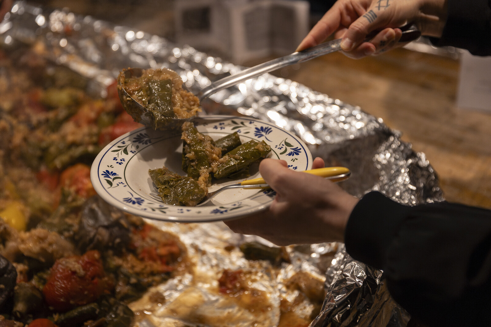 The dinner was the product of a dialogue between the collaborative practices of both artists, a continuation of Jacir’s project on Zuaiter, Material for a Film (2004−ongoing), and a reflection of the efforts of the artist-run space Dar Jacir, in Bethlehem, to foster cultural healing through collective activity. The menu, created by Rakowitz and prepared with Khaled Karri (founder of the Makan nomadic food project), started with Zuaiter’s own recipe for hummus—which substituted peanut butter for hard-to-find tahini, conveying how immigrants adapt to new contexts. Rakowitz, whose Jewish family fled Iraq in the wake of the 1941 Farhud pogrom, noted that the meal was taking place on Yom Kippur, and “in the calendar of my religion, today is the day of atonement.” He explained that he wanted “to create a space and the circumstances through which we could bring Wael out of the sphere of death and into the sphere of the living.” To the clanking of bells, he and Karri carried a gigantic pot of Mhasha—vegetables and grape leaves stuffed with rice spiced with sumac—through the cheering crowd.