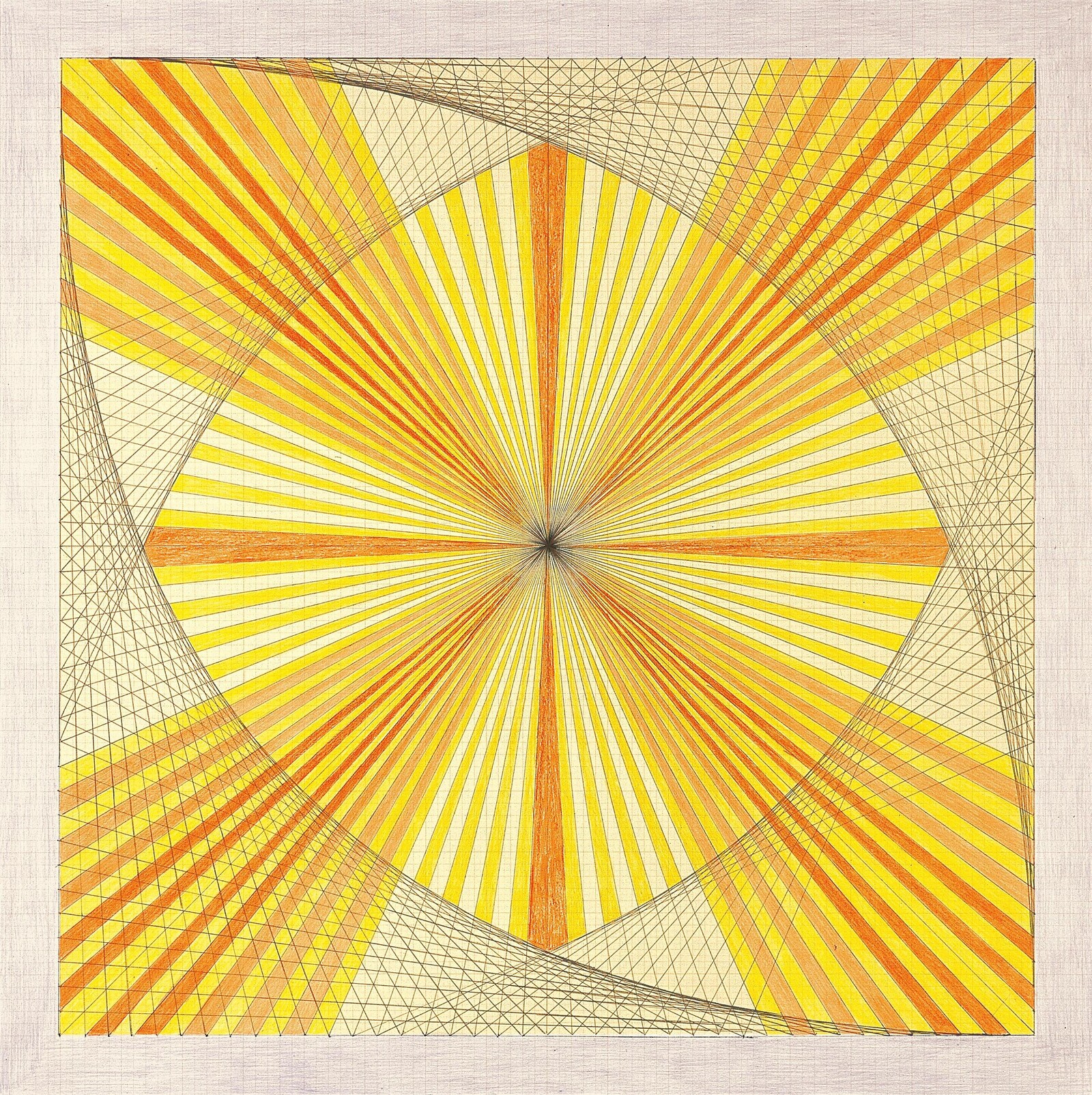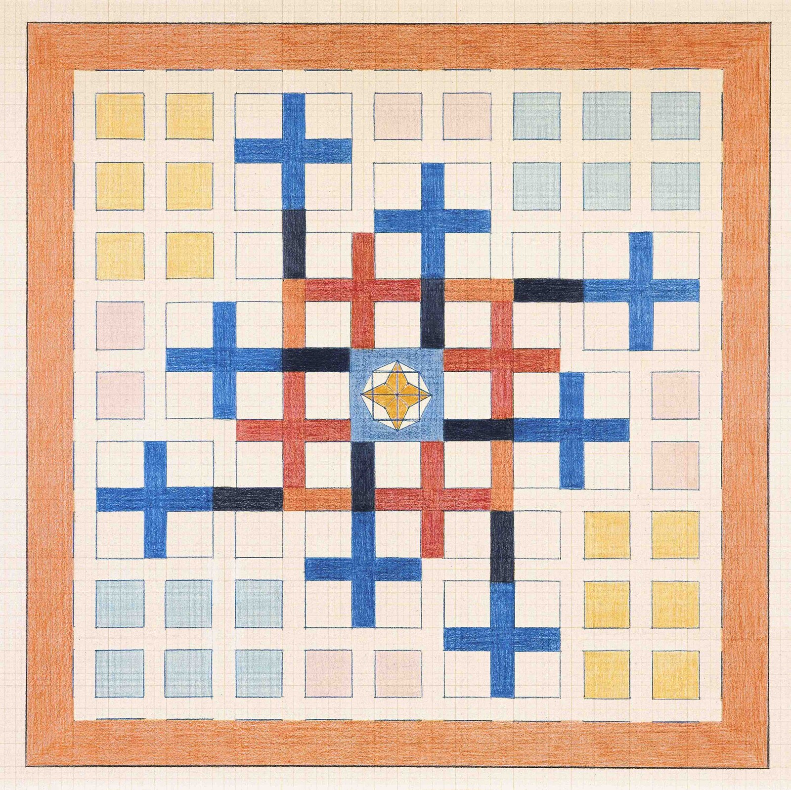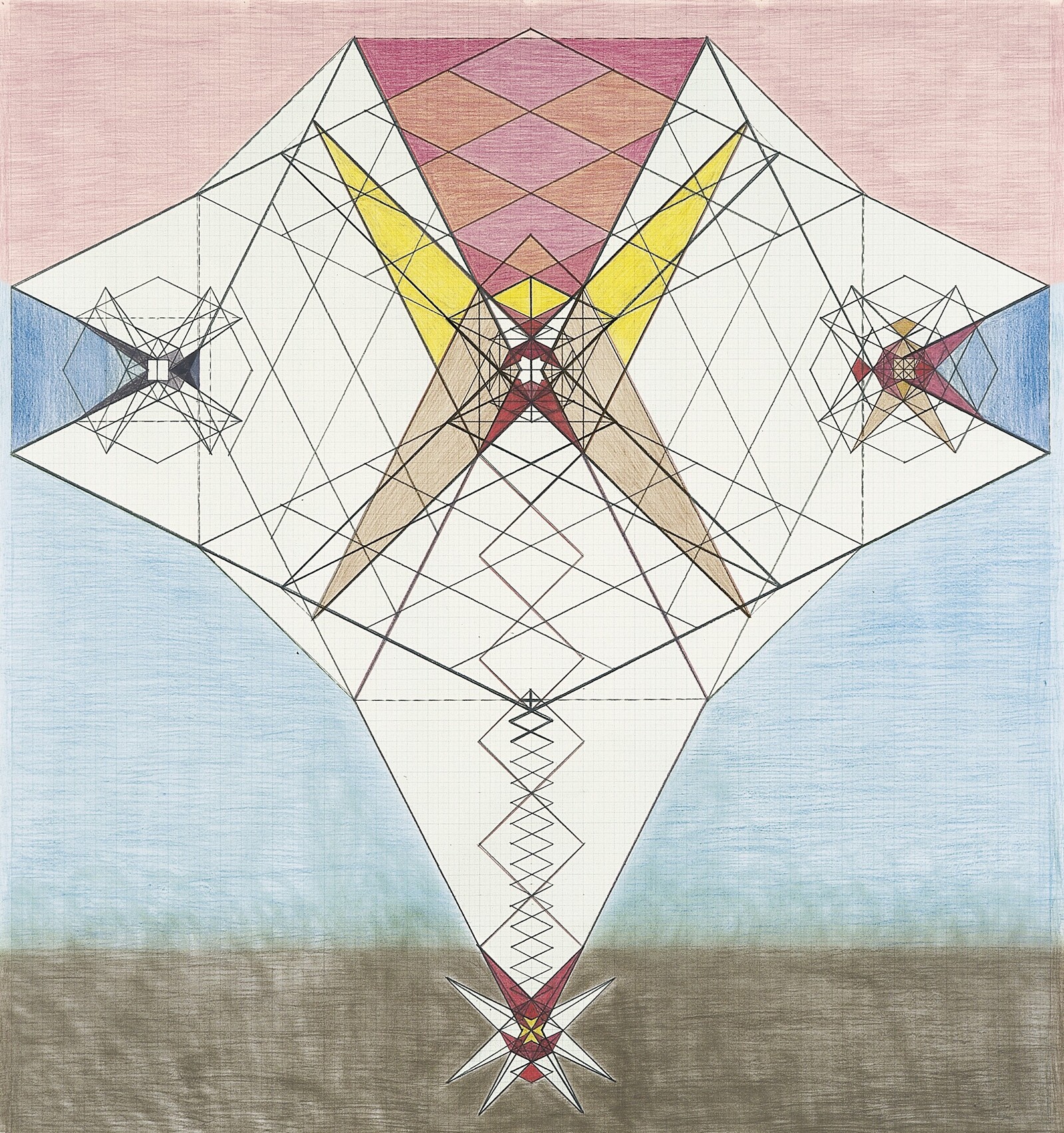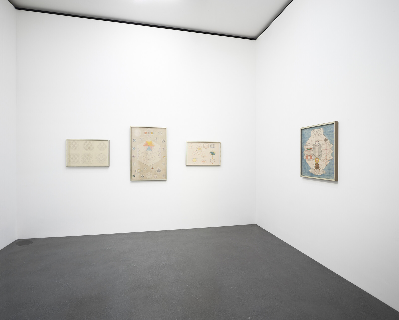 Work No. 392, a graphite wheel with washes of pink, green, and blue, thrums with the density of its radial lines. In Work No. 136, a central diamond of blue and orange crosses is enmeshed in a crystalline web of multi-sided shapes; at the four corners are figures resembling bats or butterflies. When the drawings are overtly figurative, they can be foreboding: in Work No. 99, a host of figures in the bottom half of the picture appear to wait for judgement from a commanding upper figure whose wing-like arms are poised over crucibles to either side. Across multiple pictures, a man and a woman are seen side by side, an embryonic child often superimposed on the female. Kunz’s shapes often emerge by virtue of fractional adjustments in the angles of her lines; in more abstract works, this means that edges are softened, the shapes limber up and begin to lift off the page. Sometimes they shoot out into fantastical architectures or dazzle the eye. The symbols she delineates are often familiar—artists have long been perfecting variations on crosses, circles, spirals, grids, hearts, and ladders, and assigning meanings to them—but not in these constellations.