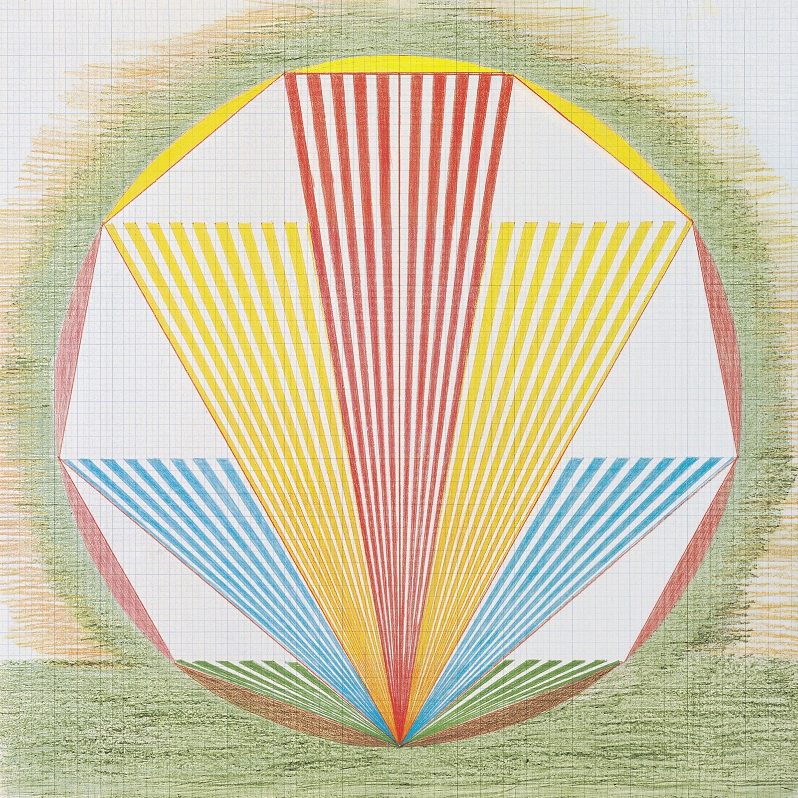 Kunz’s parents were weavers and as a young woman she briefly worked in a knitwear factory. She received no professional training in art or any other occupation, and her drawing seems to have been a secondary element in her healing practice. Since her death, several monographs on her work have been published, in part, it seems, to establish her credibility as an artist as well as a naturopath, including sometimes contradictory accounts of how she made her drawings. Kunz worked standing and moved her pendulum over the paper, waiting to be guided by it before she made any marks. She did not calculate her forms in advance, though she sometimes noted figures on the margin, as is the case in Work No. 382. Each drawing was made in response to a specific question and followed a scheme of significance in which left denotes evil and right good, down denotes earth and up heaven. Across this are laid the four classical elements of air, earth, fire, and water.