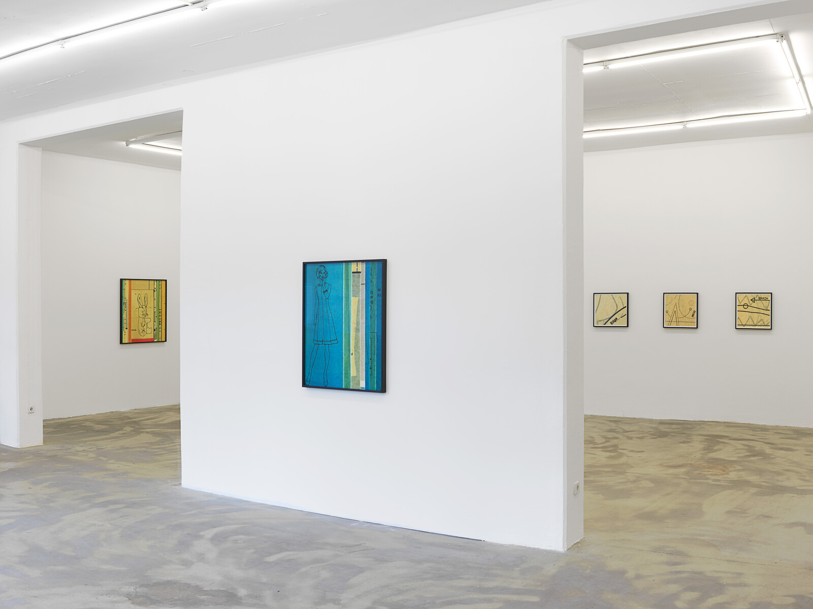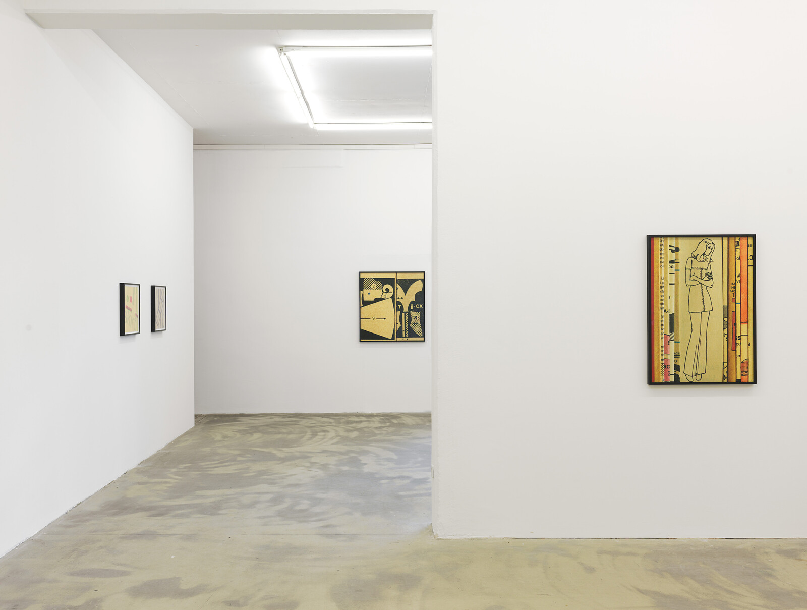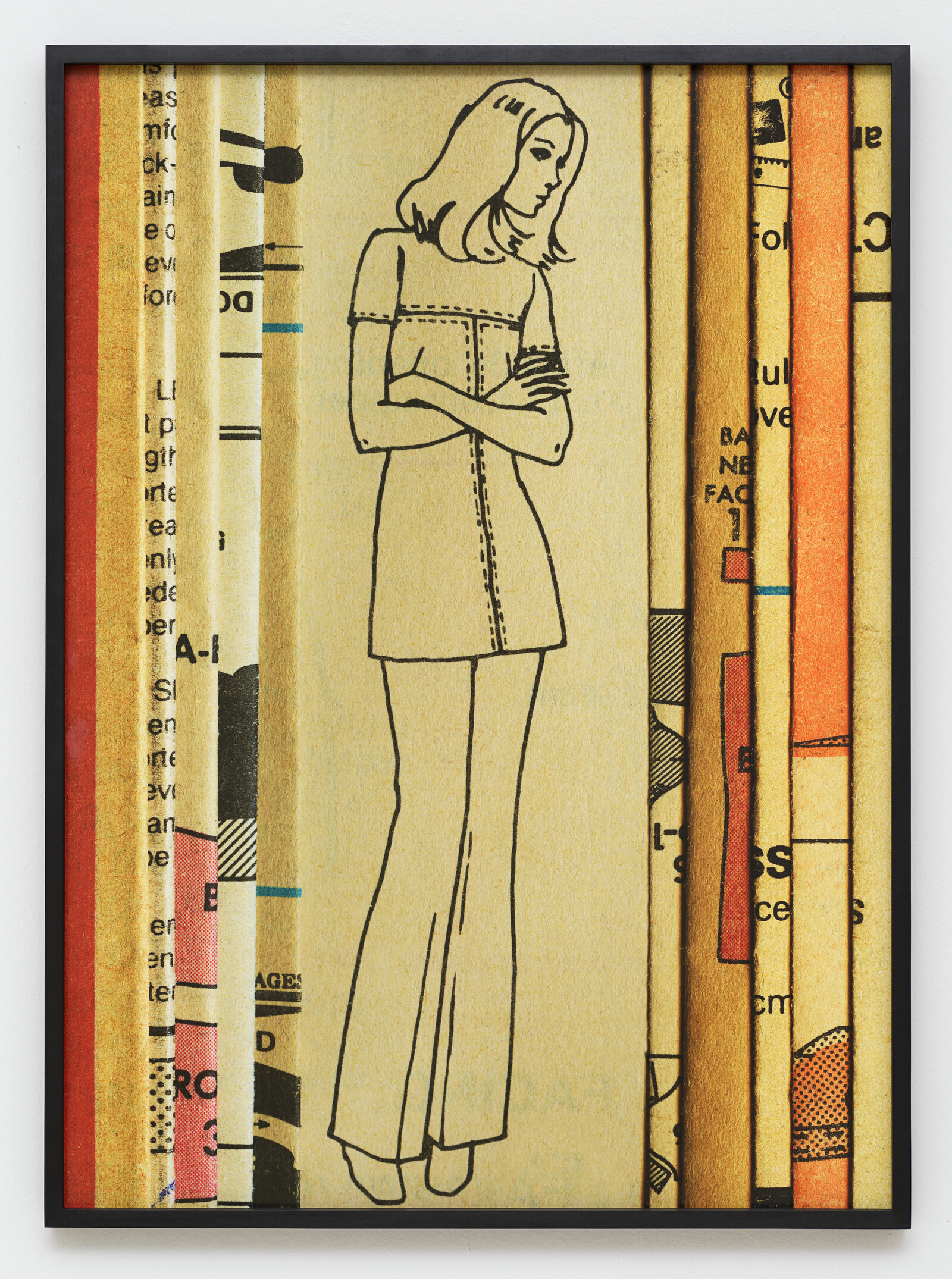 Here and in Arms Folded, where a diagram of a woman with arms protectively crossed is bounded by thin columns formed by folded-back pages of patterns—a range of possible dress-up options, templates for femininity—the embedded gender politics of Baum’s practice glints most strongly, hitched to a parallel refusal and undoing of power on the linguistic front. The exhibition might indeed be read as performing literal close reading, being split into photographs that clearly represent models wearing clothes, and ones where you’re pressed up against the pattern and meaning falls apart and realigns into speculative new formations. The work listed twelfth on the handout—actually the first thing you see on walking in, on a freestanding wall in the center of the one-room gallery—stars another stereotypical model, big eyes and a bob, outlined in black against sky blue. Her forefinger is on her lip, an expression the illustrator presumably imagined to be dreamily pensive. Baum, jamming codes, has titled the work Worry.
