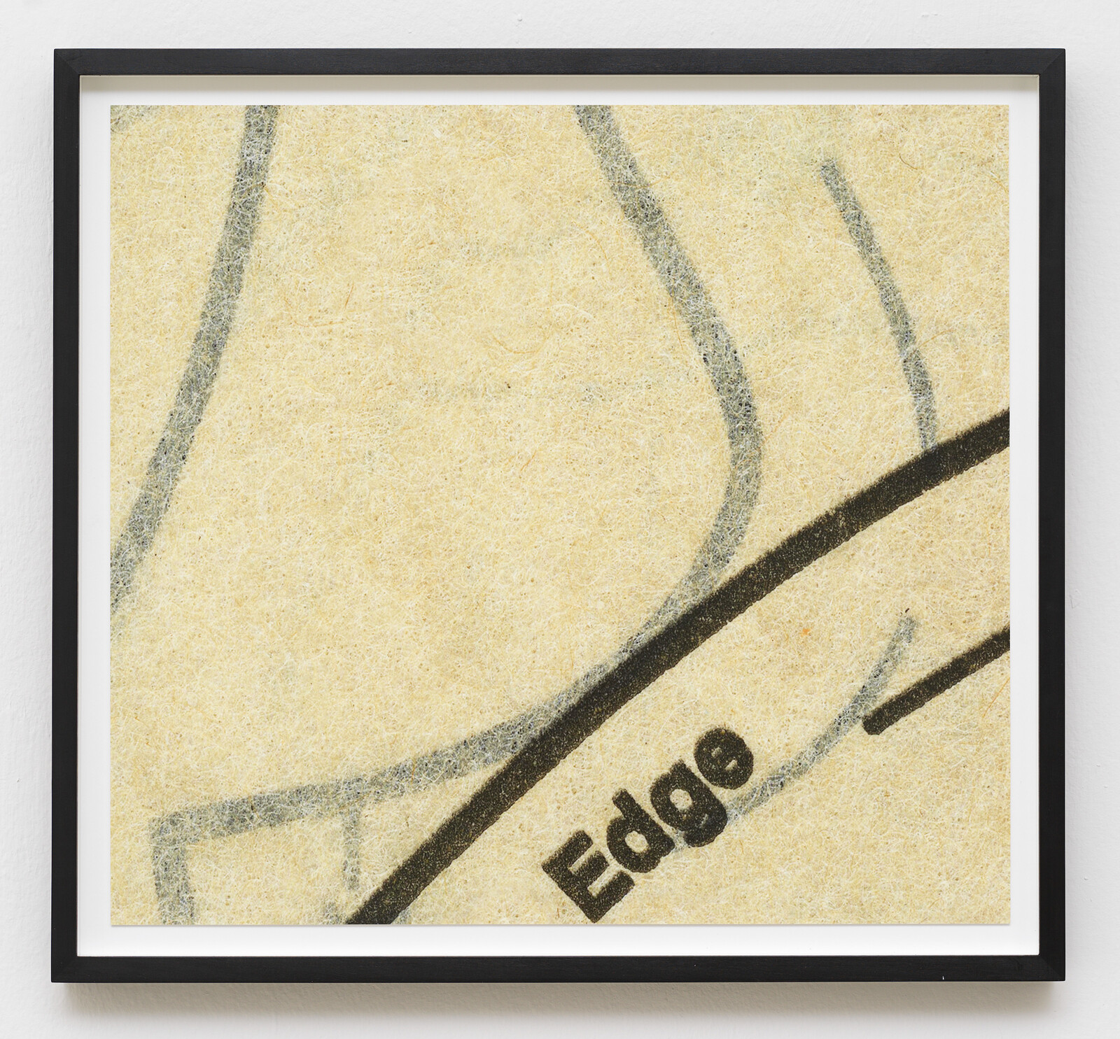 Since the mid-1990s, Erica Baum has been coaxing a fragmented poetry from the unlikeliest places, quarantining found snippets of text that never aspired to great significance and dilating both their scale and their associative potential. Early on, the New York-based artist moved her camera close to half-erased classroom chalkboards (“Blackboards,” 1994–96), releasing details of equations, diagrams, and language from the burden of signifying and making them simultaneously abstract and allusive (e.g. the slyly reflexive smidgen of chalked text “TO DEPTH”). Since then, Baum has focused primarily on worldly printed matter; in “The Naked Eye” (2008—ongoing) she took stipple-edged trade paperbacks from the sixties and seventies and photographed them side on, scraps of illustration and text peeking chancily through tightly formalized verticals. For all her scrambling, though, the conceptual dynamic feels legible. A second-wave wrangler of Pictures Generation insights, Baum aims to illuminate a covert, sometimes incriminating largesse in the discarded and to purposefully collapse together not only high and low, as we once called them, but visual and verbal, banal diagram and highfalutin abstraction, the Apollonian and the edgeless.