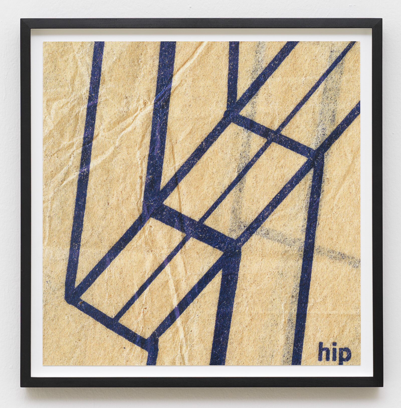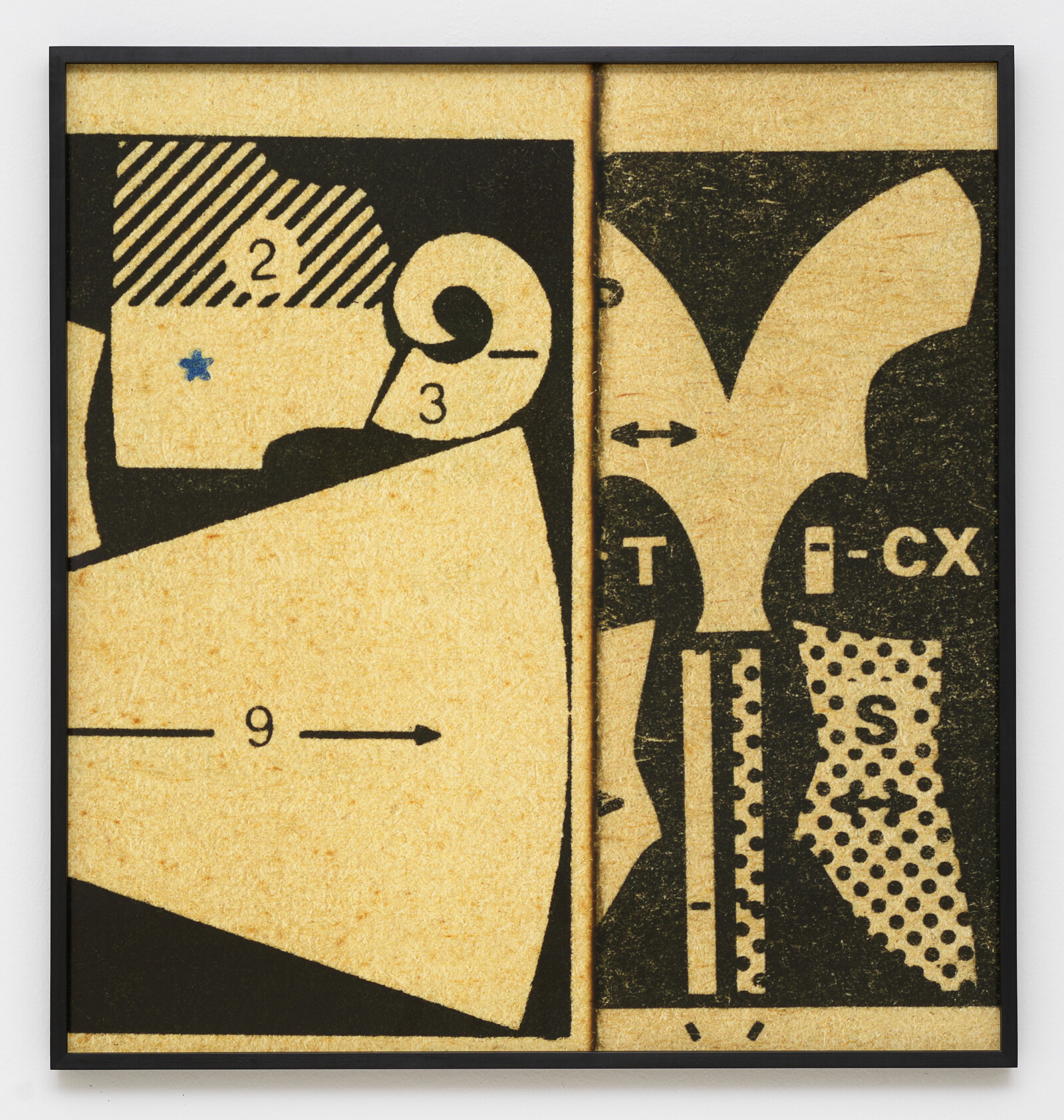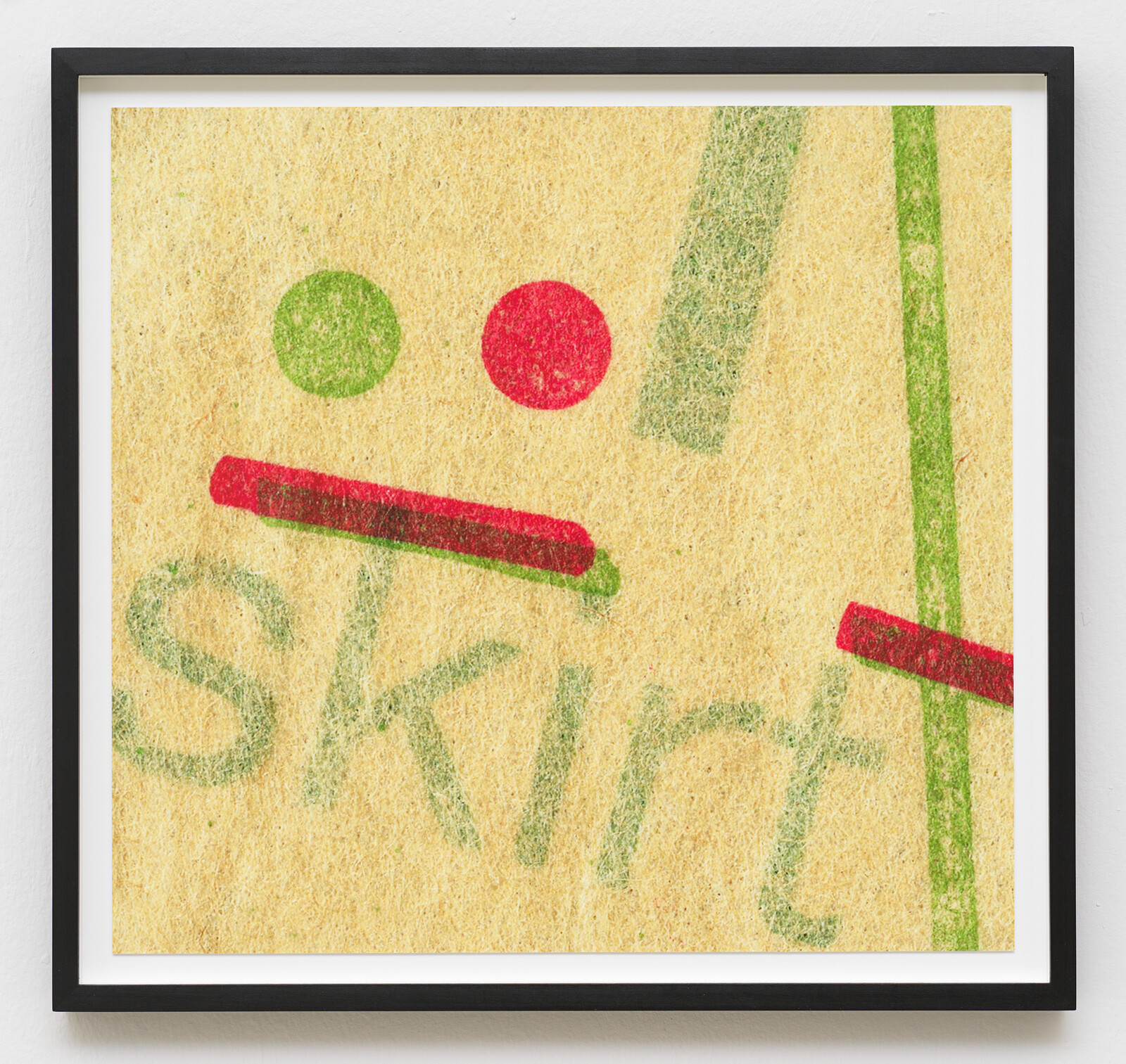In Grain (all works 2019), a pair of wavering black lines thread across the yellowish pattern paper, the upper one enigmatically bisected by a circle, and converse with sawtooth-like markings on the verso. A firmly printed arrow shoots in from the right. It points, a textual addition clarifies, in the direction of “GRAIN,” a term relevant to pattern-making (you either cut fabric on or against the grain, i.e. along the bias), to the aesthetics of photography itself, and to the idea of the singular iota within a larger whole. To read a sewing pattern like this is to go against its grain of meaning in order to find a new seam, to allude to a cultural grain, to discern obscured patterns. In Skirt Green Red, the printed word “skirt” skirts both the lower edge of the photograph and the meaningfulness of modernist abstraction, embedded as it is in a composition of intersecting circles and lines that sit halfway between the ambits of Constructivism and the ostensibly more humble activity of dressmaking.