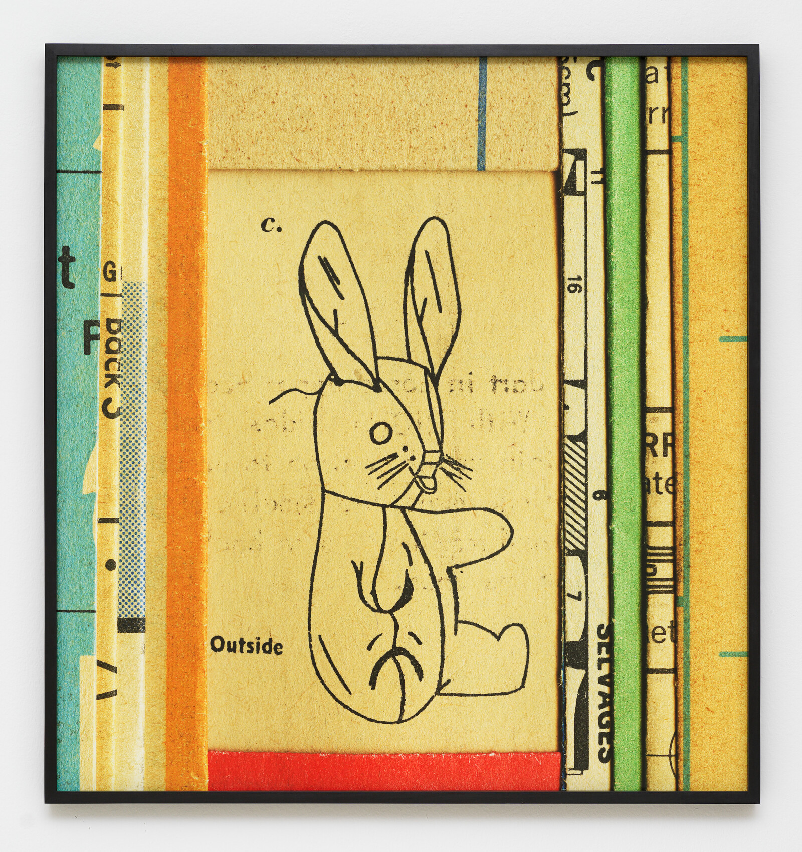So she has a furrow and she’s ploughing it diligently, or, to extend the spatial metaphor, Baum is the sort of artist whose practice appears continually likely to run out of road, but then she finds another half-mile or so to cruise along. For the 2019 series “Patterns,” showcased by the twelve photographs in her latest exhibition at Klemm’s, Berlin, she’s alighted on faded sewing patterns for the home haberdasher, seemingly beamed in from the mid-sixties, printed on thin paper that allows for bleed-through of design and text. When Baum photographs these at varying degrees of distance, the result is a mixture of cleanly retro black-outlined imagery—a rabbit toy for children, slacks or knee-length dresses modelled by slim, stereotypically pretty women who could be minor characters in Mad Men—and compositions that abscond from representation because you can no longer see the wood, only a couple of trees. Or, technically, a snatch of graphic patterning in conversation with stranded and newly reverberant words.