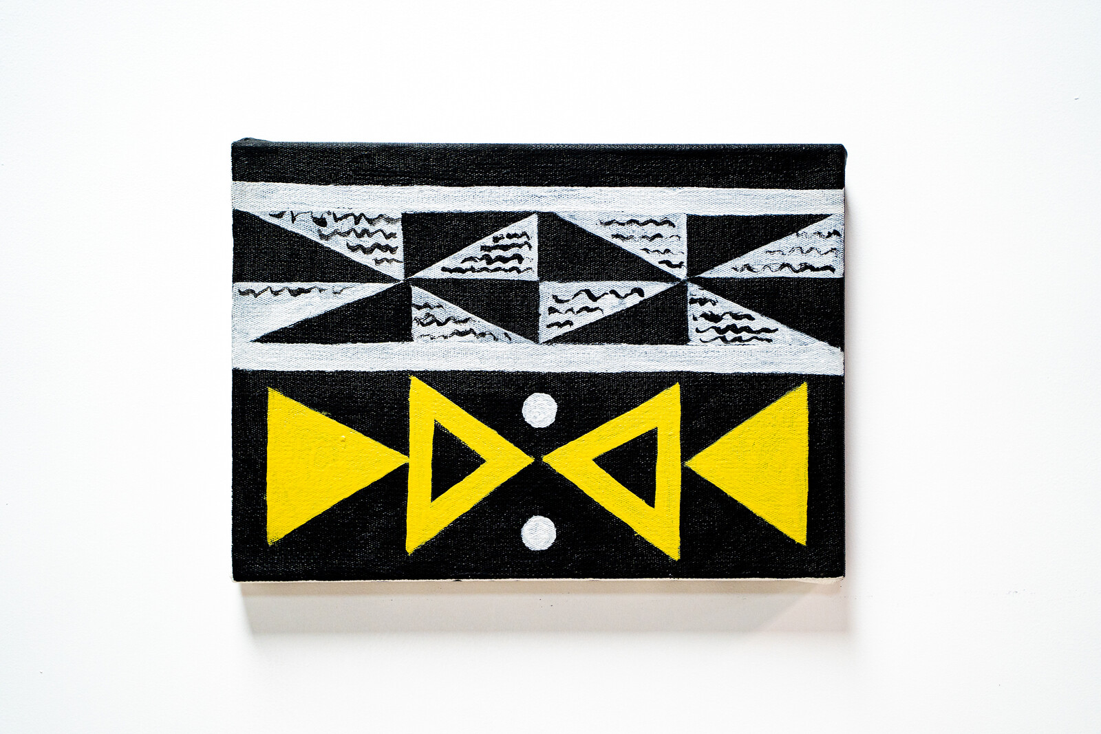 An exhibition that attempts to accommodate these competing narratives of Indigenous craftsperson, national standard-bearer, self-fashioned female artist, modernist painter, and Warholian entrepreneur opens with eighty-seven small canvases hung in a grid on a peach-painted wall, each of them featuring a design in flat, bright colors (one exemplary Ndebele Abstract, 2022, arranges four yellow chevrons on a black ground separated from a repeating pattern of rotating white wedges by the band’s white border). The implication of their positioning is that this might be the visual alphabet out of which the artist constructs the more complex patterns of her larger paintings and murals. But if these forms do carry symbolic meanings, they are not elaborated upon, and the placement in front of the grid of a pair of painted ballroom shoes (Suid Afrika Vorentoe, 2003) confuses any such attempt to read the work through established art historical frameworks, whether ethnographic, formalist, or mass cultural.