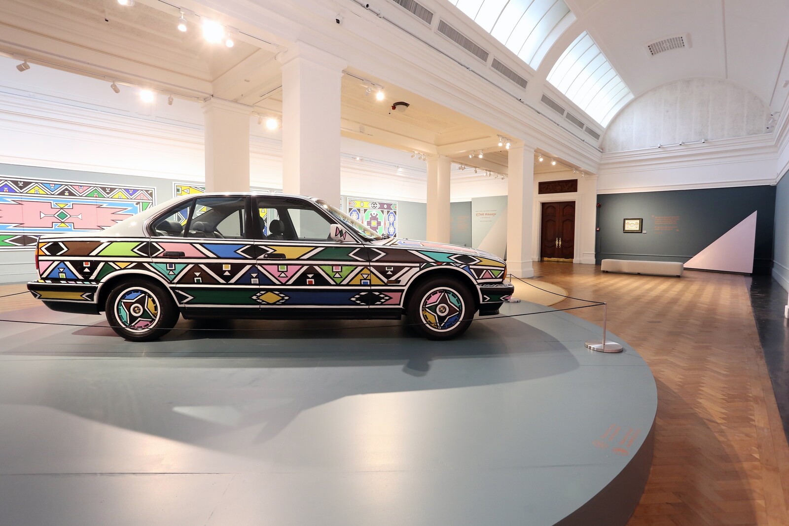 The invitation was to participate in the 1989 exhibition “Magiciens de la Terre” at the Centre Pompidou, a show that continues to cast a long shadow over attempts to decenter or decolonize the representation in western institutions of global visual culture. Mahlangu contributed a reproduction of her own painted Ndebele house (reproduced in miniature in this exhibition), setting in train a career so prolific that her vivid polychromatic designs now serve as visual shorthand for Nelson Mandela’s vision of South Africa as a comparably vibrant and harmonious “rainbow nation.” These instantly recognizable patterns—since applied to objects ranging from television sets to sneakers to the 1991 BMW 525i positioned in the show’s final room—expand a tradition of house painting that started in the late-nineteenth century as a highly coded expression of Ndebele resistance to the incursion of Boer settlers onto their ancestral lands.