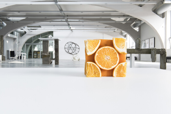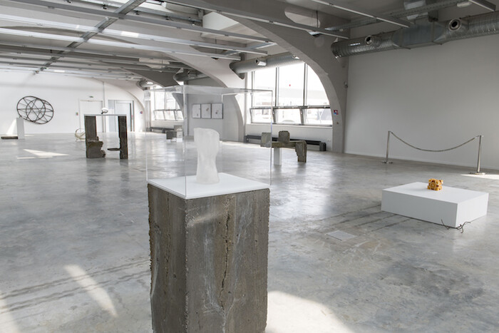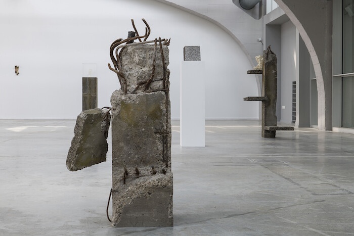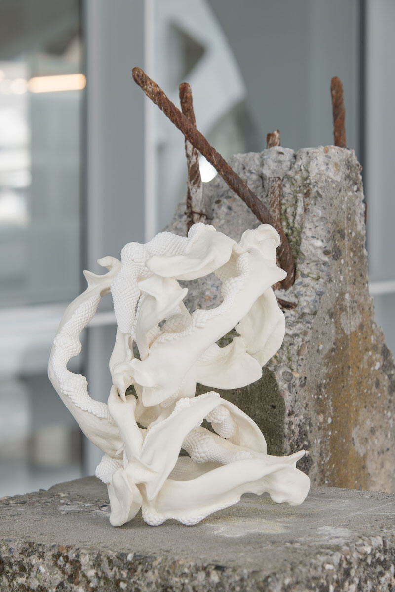Étienne Chambaud grew up in Mulhouse. In the city’s Botanical and Zoological Park was a brutalist concrete “grove” dotted with branches and tree trunks that housed the macaques; when this display was scrapped, Chambaud took parts of its reinforced concrete and wood to make the series “Reef” (2018), the plinths and benches that are now dotted about his exhibition at the Kunsthalle. A weathered concrete stalk perpendicular to the ground with four stubby branches and a chock of painted wood supporting it makes Reef (The Barrier), which notionally offers seating but also echoes a quadruped animal form. Reef (The Gorge) resembles a multi-leveled cat perch for incarcerated urban felines, made in the same concrete with rusty iron spines protruding up top. The work also becomes a plinth for Entrelacs [Knot/Interlace] (2018), several white polyurethane reproductions of a bowmouth guitarfish jawbone that have been intertwined, which should be impossible as they are closed rings. The faithful reproduction of the bones looks uncannily like a 3D printing design.