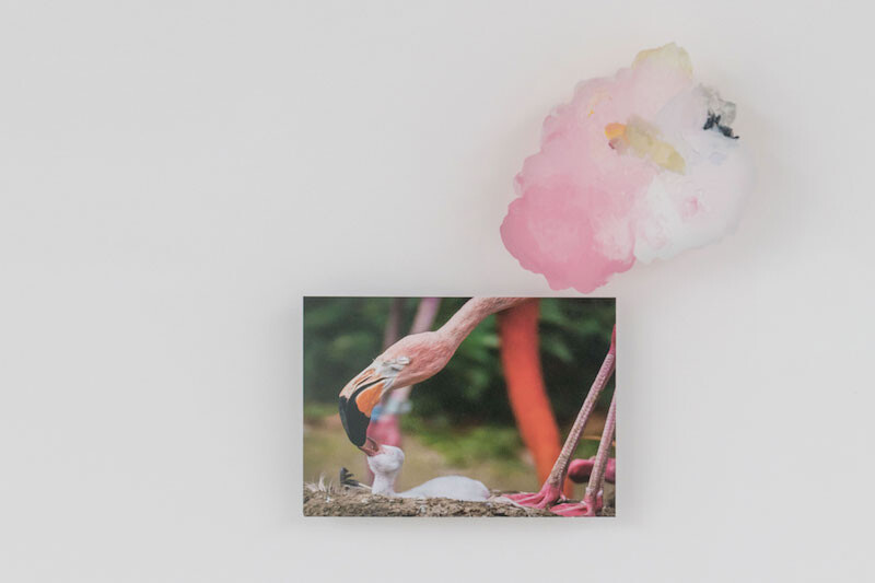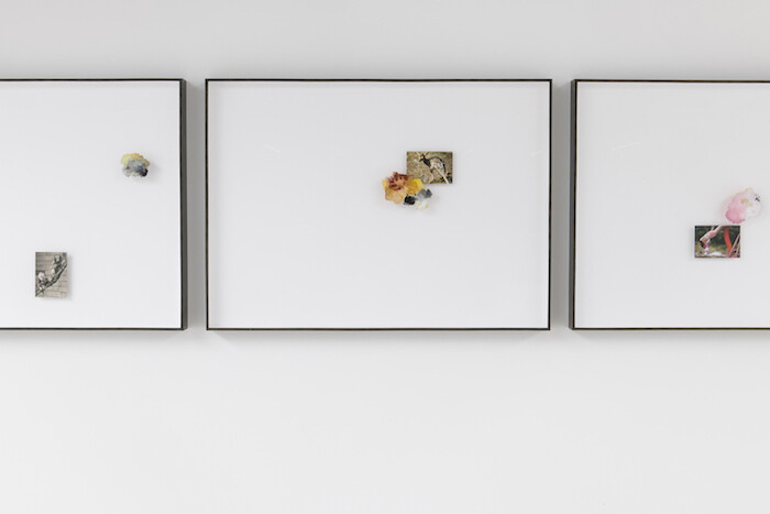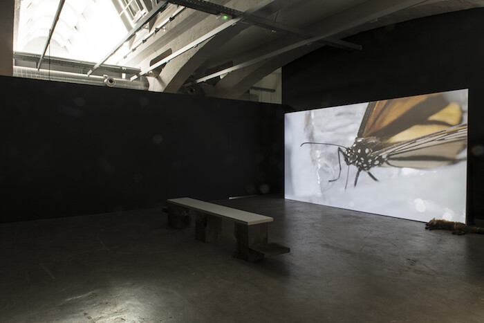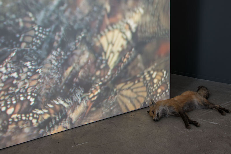 The 2016 video work INCOMPLT shows an astonishing seasonal gathering of monarch butterflies in Mexico, so numerous that they form pulsating carpets where they alight. They rest on natural surfaces as well as on a pile of 0 and 1 figures carved in ice that Chambaud has brought to the location. 0 and 1 being, of course, the components of binary code, the butterflies literally hover over a heap of potential meaning that thus lies amassed, undecipherable, and, presumably, ignored. Chambaud’s camera observes the insects and their environment extraordinarily closely, then suddenly shifts its focus, making us acutely aware of the mechanics of image-making. Effectively, Chambaud won’t allow us to be utterly absorbed by the scene. To add to our discomfort, a taxidermied fox lies on the ground beside the screen. According to its title, Dead Dead Fox (2014–17) is a dead image of a dead thing, but, in the gloom, it has the look of a half-sleeping animal that mimes repose but watches intently. Throughout the exhibition, we viewers are repeatedly appealed to, only to be pushed back to arm’s length: up close, our gaze is rejected, as in the case of “∩” series of works, in which Chambaud paints shut the eyes of animals in zoo postcards, his acrylic color matching left as an artifact inside the glass of the frame. The ∩ in the title is a mathematical symbol signifying the intersection of sets. If categories or genres are also sets, we are on unstable ground, without certainties of what is artwork and what is test, what is sculpture and what is support, or how far the exhibition extends: Additive Expression (2013–18) is a pile of blue-colored bird food, in one corner inside the building but also offered to the birds outside and ultimately redistributed as blue droppings.