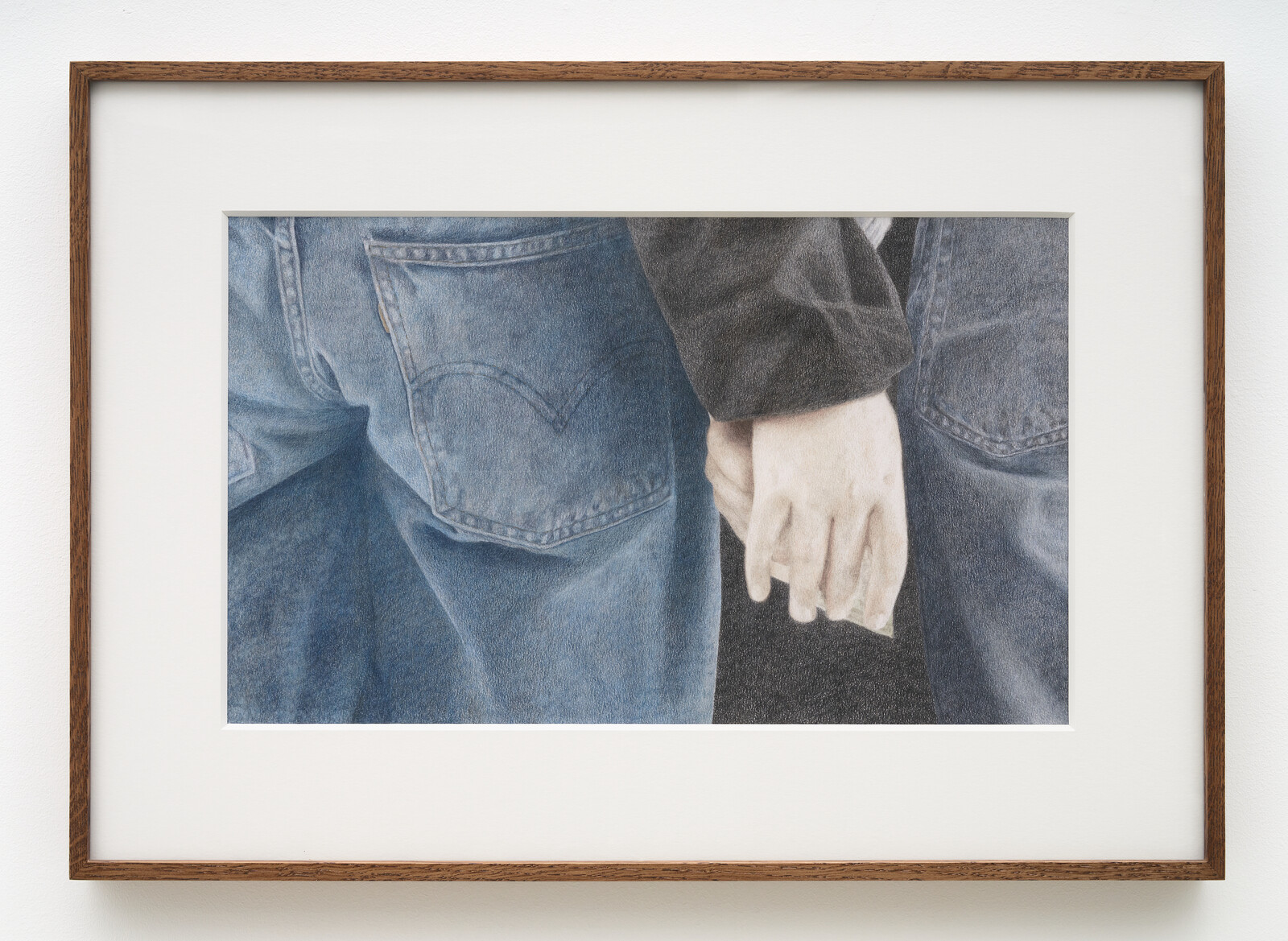 Gold’s understated drawings, hung in identical, nineteen-by-twenty-six-inch frames, line three of the gallery’s walls. In Haneke’s film, a low tracking shot follows several pairs of hands as Benny, the teenager, covertly collects money for a pyramid scheme called Pilot and Passengers that he introduced to his friends during school choir practice. Gold’s lighter, less saturated images emphasize general forms over details. From afar, viewers might mistakenly believe that they are spying on people holding hands. Up close, one still feels like a voyeur, since Gold’s static renderings allow the eye to linger on the creases in the fabric of the boys’ jeans, the threaded borders of their back pockets, the baby fat on their hands, and the hesitant curl of their fingers as they nudge cash into each other’s palms.