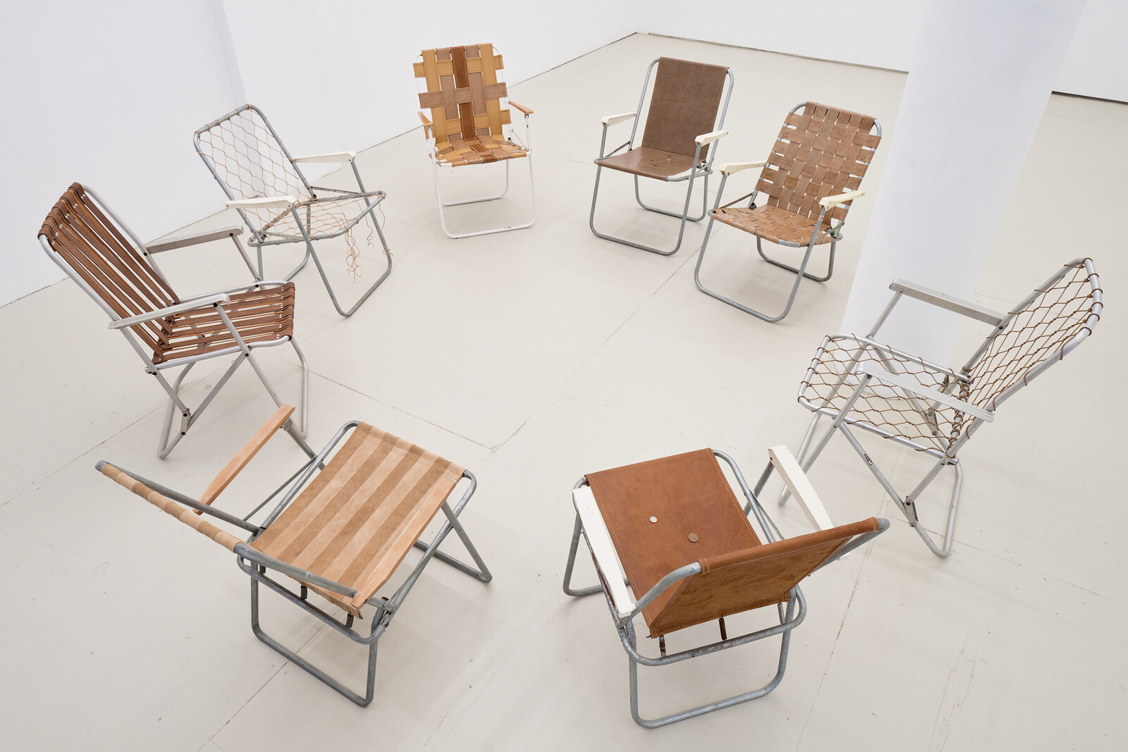 Subtle evocations of ruralism are embedded in this work as well. The choice of lawn chairs, rather than office chairs or upscale furniture, suggests a communitarian way of life. Despite being outfitted with leather, a material more expensive than the originally mass-manufactured chairs’ likely vinyl or polyester seats, the chairs in Echo Chamber are imbued with a tinge of destitution. The beige leather string twined over one of the frames, for instance, is unraveling. Two of the chairs are scattered with British and American coins in meager denominations—a heptagonal fifty pence coin, a dull penny—serving as subtle visual cues not only of regional affiliation but also of class. Another chair bears a small Union Jack sticker. Faded and scuffed, it brings to mind the fallout from the 2016 Brexit referendum. As Gold’s leather-string chair suggests, certain nationalist dreams are coming undone. The chairs have their backs turned not only on viewers—who can in theory infiltrate the ring by walking in the gaps between the chairs; though when I visited the gallery, most did not—but also on the boys in Pilot and Passengers. Like the self-absorbed adults in Haneke’s film, the implied community in Echo Chamber have opted to neglect future generations.
