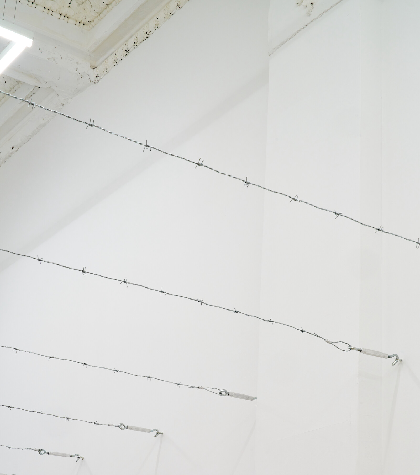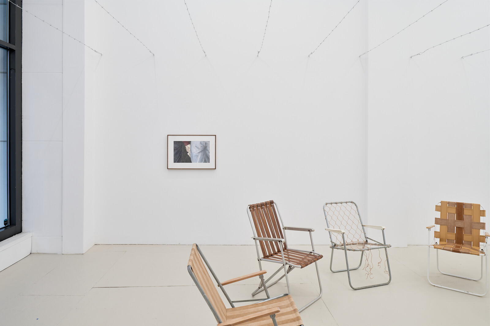 Although Benny’s Video and “Shadow Lands” both address economic and cultural power, the former lambasts those who possess it in disproportionate quantities, while the latter illuminates the common conditions among the disenfranchised. While Haneke’s film takes the form of allegory, Gold’s exhibition presents an open-ended proposition. Here, power does not play out its tragic conclusion. Rather, it has been put on pause. Banknotes linger midway between hands; barbed wire hovers in the air. The chairs, although arranged in a closed formation, could easily be moved, suggesting that someone still has a chance to change the scene.
