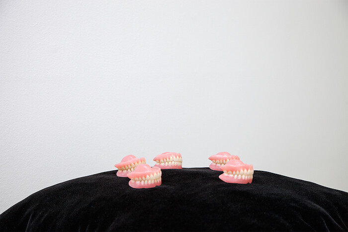 There too is Leung Chi Wo’s Untitled (Love for Sale) (2014), which plays on personal histories and coincidence: it includes a light box with an image of Manchester’s Free Trade Hall, beneath which is a button the visitor can press. Doing so illuminates the image, but in a neighboring gallery—thus not immediately apparent—a tall column of newspapers collapses, to be slowly drawn upwards again by a pulley mechanism to an Ella Fitzgerald soundtrack. The causal link is absurd, mournful yet tangentially valid: Fitzgerald had performed at the Hall and died on the same day as the IRA attack on central Manchester in 1996. Bleaker histories are the ingredients for gallows humor in the hands of Kemang Wa Lehulere, whose Teeth are the only bones that show (2016) on the upper storey of the City Gallery references digging and the Limerick Magdalene Laundry in an installation that presents, among other elements, four sets of shiny gnashers on a velvet cushion.