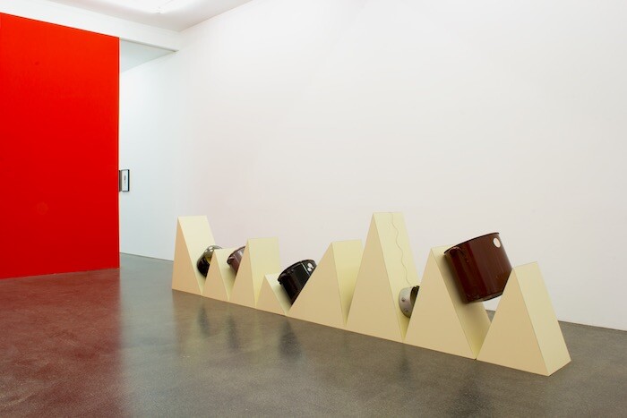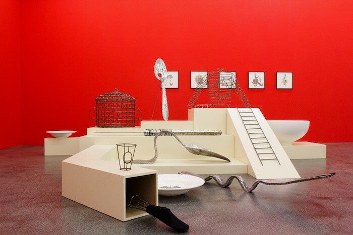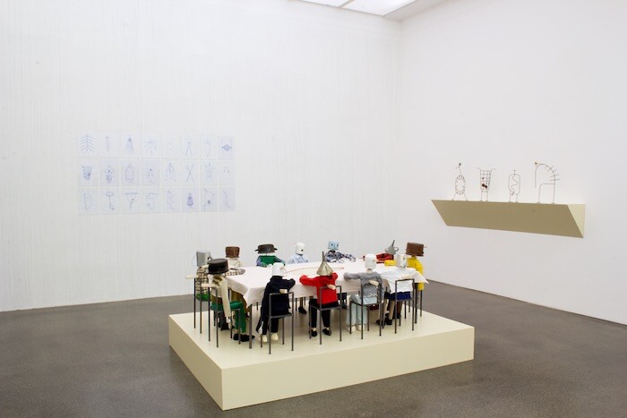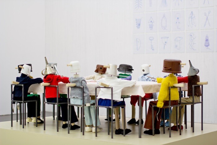 Then again, Kot’átková’s bricolage of the now is simply mesmerizing. The works assembled at Meyer Riegger indulge the visitor with saturnine splendor. Photo collages of a hedgehog nibbling on a piece of raw steak, a nautilus-boy chimera absorbed in his thoughts, and a heart-headed girl singing a song all hijack our fantasy. We are drawn into an exosphere of infant dreams saturated by sugar, tears, excrements, and the nebula of the unconscious. Here, gigantic spoon sculptures have holes in their middles and iron frame torsos’ teeth-baring ventricles. The centerpiece of the show is undeniably a table accommodating 12 petite wooden puppets with enameled pots and watering cans as their heads. The table companions might not be sharing a meal cum panis. Nevertheless they are still “tying knots of many kinds,” as Donna Haraway writes about companionship.3 In the film we learn more about it. The last sequence shows Kot’átková’s child actors in a landfill, “returning things to life, becoming things,” as the voiceover tells us. With thrown-away objects on their heads, they seem to re-create the Pots-and-Pans Revolution,4 turning the rumbling of an afraid and hungry stomach into a march for dignity and “empathy with the suffering of another.”