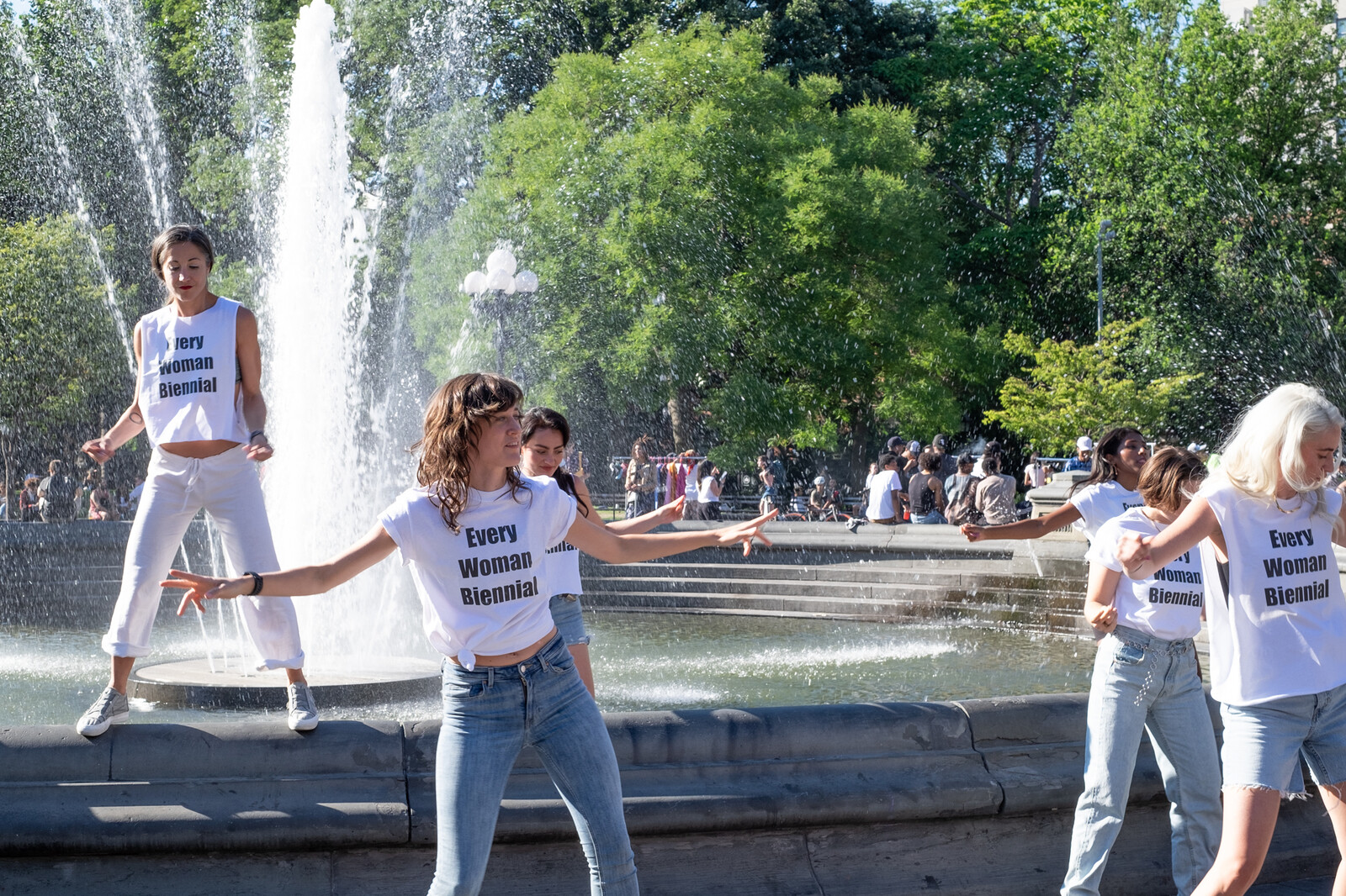 One thing that the OpenSea NFT platform couldn’t replicate was the real-life buzz of an opening. EWB countered the coldness of the blockchain by hosting a small New York vernissage with signature flair. On a picture-perfect early summer evening, a dance crew perched along the fountains of Washington Square Park to perform a choreographed routine to Whitney Houston’s late-’90s jam “My Love Is Your Love.” The throngs in the crowded park joined a mini dance party of artists and supporters, who released tinsel streamers from party poppers and bopped to hits by ABBA and Chaka Khan. Walking from the park to nearby Superchief, people murmured about Palestinian liberation and hot flashes. The pleasures of a feminist-identified mass!