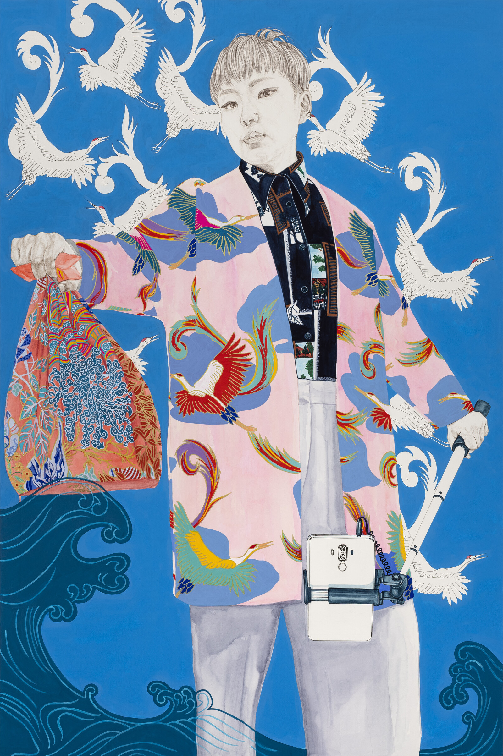After taking in an overview of the biennial’s offerings, I left the gallery in order to browse the remainder of the show on the Superchief site. Like earlier editions of the EWB, a number of works flaunted the body in all its visceral glory. Caviar, by Leah Aron, documents a 2009 performance for which she injected and expelled bright red caviar eggs from her vagina; the soft-focus closeup image Dreamy Girl (2021) by Sandrine Segula depicts a vulva adorned with flowers. Less explicit, but no less erotic, art included Padma Mudra/Unconditional Love by Cuntemporary Artist—a clip of a nude performer enacting a brief yogic meditation, filmed with infrared technology—and works like #BlackLivesPortal (Red Series) by Christa A. Bell, blending a frank depiction of self-pleasure with a gif of the cosmos. Portraiture also dominated the show, from self-portraits to Katrina Majkut’s images of Serena Williams, a digital collage by Tijera S. Williams modelled on Botticelli (The Birth of the Black Woman, 2021), and Kira Nam Greene’s I Slay (Kit)—a gorgeous, vibrantly patterned edition of a painting from 2020. The artist/designer Kit’s pose, with a purse in an outstretched hand, mimics that of David with Goliath’s head in Caravaggio’s famed painting of the Biblical figure.