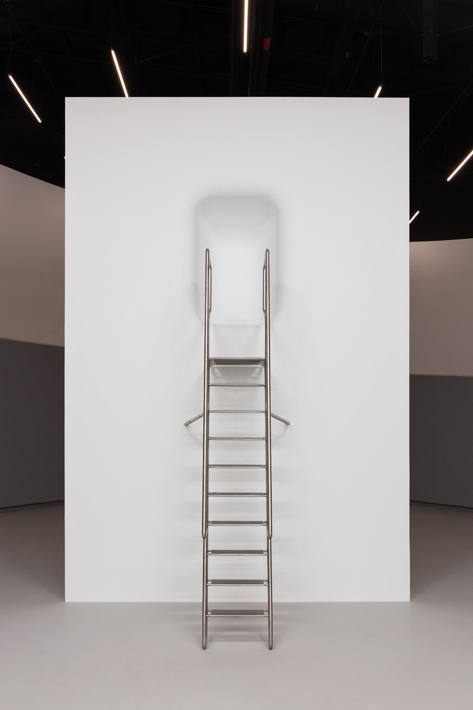 A complementary strand of Faustino’s practice explores the potential violence and inherent power of domestic and other design objects. Love Me Tender (2000), for instance, is a chair made of stainless steel whose tube legs are whittled down to meet the floor in sharp points. Threatening to penetrate the surface of whatever lies beneath, concentrating the weight heightens the agency of whatever sits on top. Other chair works, such as Tetsuo (2012), resist the furniture type’s normative functionality by providing an armature for sitting without it being clear exactly how one is supposed to sit, or how the chair itself is supposed to stand. The idea of a non-normative design is carried even further by Intruder C (2021), an awkward multicolored steel tubular object whose form resists any conventional mode of usage and demands to be discovered through experimentation. Dismantling the power of design objects is made most explicit in his series of works with steel barricades, such as BUILTHEFIGHT (2015) and Untitled (2019). Most commonly used to control crowds and police public space, the power of these objects can be formally manipulated, recomposed, and deployed towards other, more sublime and emancipatory ends.
