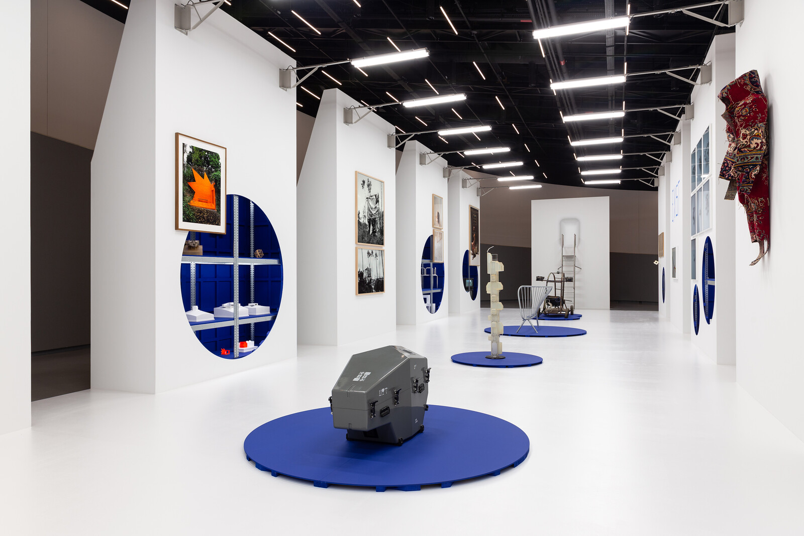 Along their descent down the ramp into the MAAT’s ovular, central exhibition space, visitors encounter a series of angular, austere, and imposing structures that are formally reminiscent of military architectures. Like medieval castle walls, with embrasures mediating the simultaneous necessity to look out while not letting anything in, gaps between the structures obstruct and frame views into a brightly illuminated, enfilade-like space. The perceptual logic of concealment and revelation is carried further by a series of circular cuts made to the structures’ inward-facing walls that confess their hollowness while presenting a panoply of material from the architect/artist’s dynamic, evolving, and multifarious practice.