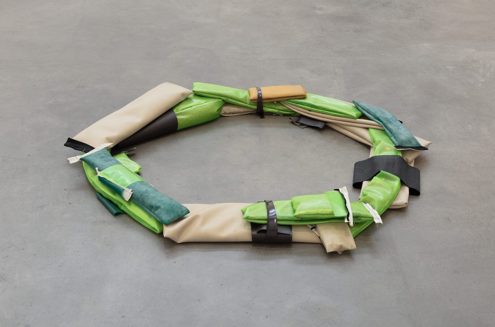 Bordered by the peppercorn, The Rice Wall 03 (2024) is an eloquent gesture of self-defeat: Tant Yunshu Zhong’s floor sculpture is an arrangement of green and beige rubber sacks, filled with rice and its husk, arranged in a circle. This combination of materials refers to the 1952 Rubber-Rice Pact, effective till this day, overseeing China’s export of rice to Sri Lanka in exchange for rubber. In Zhong’s version, the former is embraced by the latter, like husk to crop, transgressing the concept of boundary in a closed loop: intimacy in trade mimicking that found in nature.