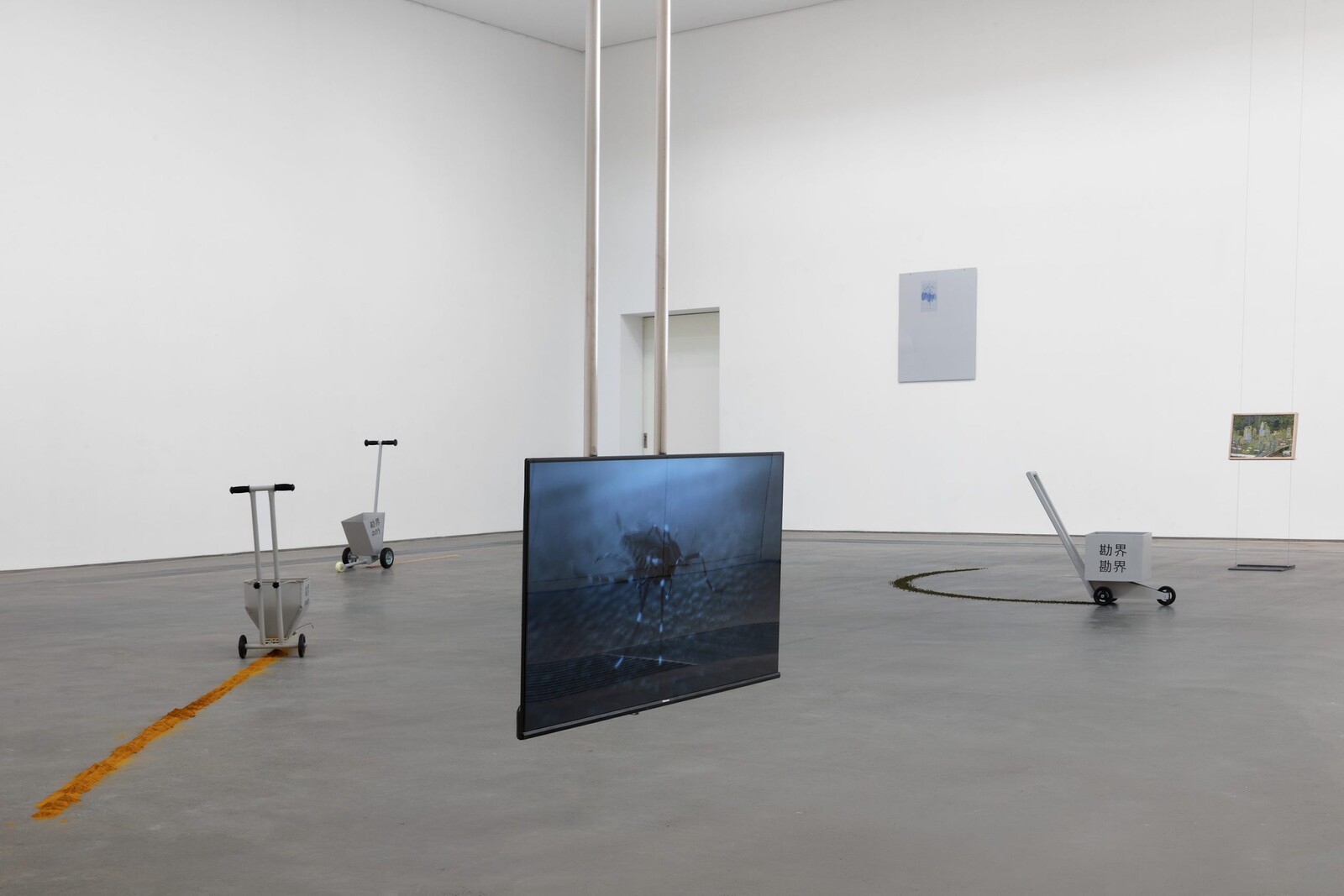 A trail of black particles leads across the floor to a metal trolley marked with letters in Mandarin “勘界” (Boundary Survey), repeated twice. Closer inspection of the trail reveals the particles to be Sichuan peppercorns. Looking around, I find two other identical trolleys with the same phrase in Mandarin and different languages: Ethiopian (loaded with white sesame), and Hindi (turmeric). Three trolleys form the Guerrilla Squad (2018) by Liu Xinyi, the lines of which seem to divide and map the gallery while the aromas of the spices spread throughout the space. The resulting blend of aromas, in contrast to the boundary-like visual quality of the lines themselves, speaks to tensions visible throughout this exhibition: between boundaries and exchange, Indigeneity and extraction.