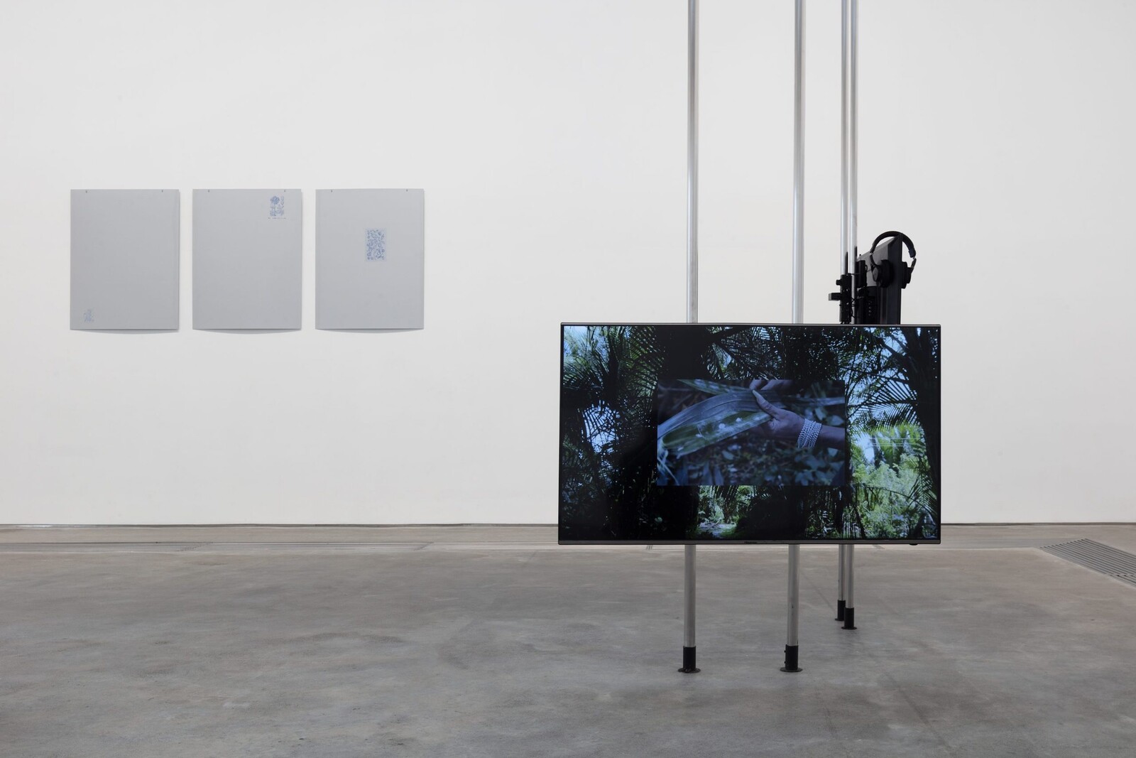 At the entrance, a TV screen supported by two metal poles shows mosquitos drawing blood from human skin, then copulating. Isadora Neves Marques’s hyper-realistic digital animation Aedes aegypti (2017) depicts, as the exhibition text explains, a particular type of mosquito subject to genetic modification by biotechnology company Oxitec. To combat the diffusion of malaria (traditionally treated by quinine derived from cinchona), a “self-limiting” gene is injected into male mosquitos, meaning that their offspring don’t survive into adulthood. An alternative antidote is disclosed on the wall behind the viewer: a botanical illustration of quinine from the Illustrated Manual of Chinese Trees and Shrubs (1937), printed in blue.