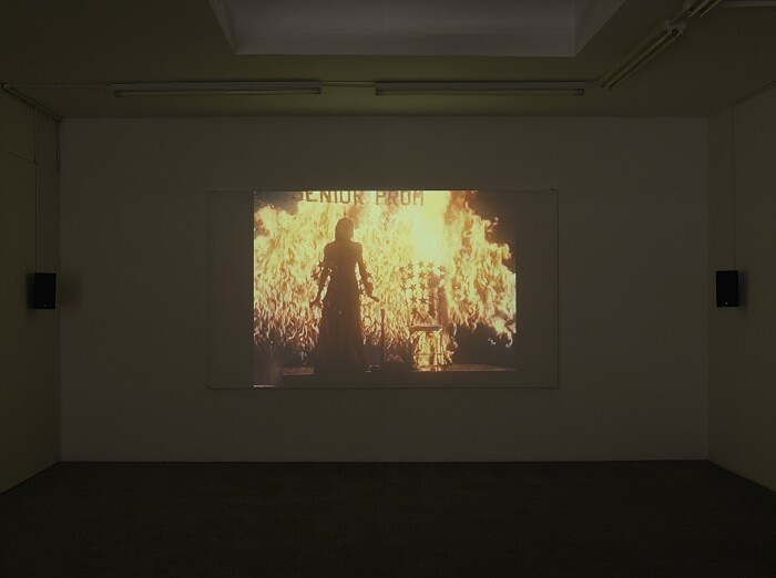Evokation of My Demon Sister (2002) by Ellen Cantor is a short video that can be taken to represent Gibson’s program in whole: nostalgic yet contemporary films and videos that exorcise previously made materials through acts of ritual, trance, and hypnosis. An example of this détournement in Cantor’s work occurs as actress Christine Noonan delivers the above dialogue from Lindsay Anderson’s teenage rebellion film If… (1968). Simultaneously we see a montage of clips from Brian De Palma’s Carrie (1976)—Sissy Spacek’s title character shatters a mirror with her gaze, causes a fatal car crash, and summons flames that engulf the stage of her senior prom—while Mick Jagger’s caustic synthesizer loop from Kenneth Anger’s Invocation of My Demon Brother (1969) plays over the top. Cantor’s Evokation reacts against Anger’s phallocentric work, harnessing its satanic energy toward a reclamation of the trope of the female hysteric. Showed consecutively on a single screen, the sequencing of the works functioned in a different way than if they were all separate, looping projections that viewers came to at their individual pace. Connections are made in sequence and each of them flows into the next. Cantor’s Evokation begins with the moon, calling back to Clark’s white spotlight, and ends with a mass of flames, a fire which roars through the first sequence of Michael Robinson’s 2013 video The Dark, Krystle.