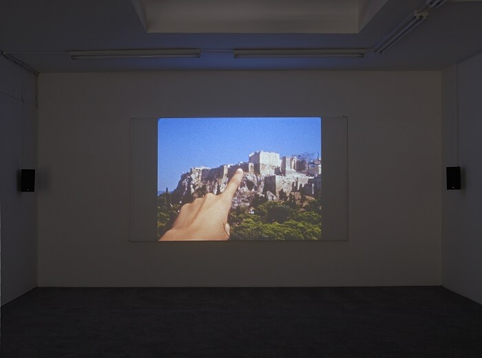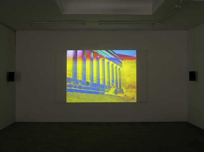 A walk through an ancient, crumbling temple, the filmmaker dressed in white and holding a microphone leads to a violent yellow/blue flicker. The perspective shifts to a first-person view of the filmmaker’s body emerging from repose on an ocean cliff. She stretches her hand in front of the camera, touching the horizon with her finger, causing a flash frame to transport her to another location.