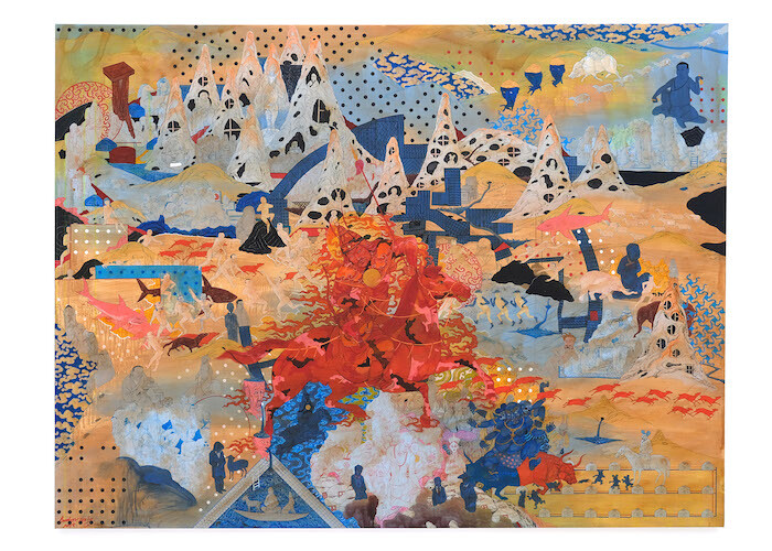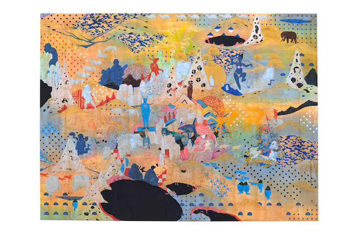 In his two lurid acrylic paintings—“MNG 1 & 2” (2018)—Baatarzorig Batjargal converges the hallmarks of “One Day in Mongolia” genre painting, which depicts scenes of nomadic life, with contemporary Western references. There is a cruel-looking Mickey Mouse and a ghoulish Uncle Sam alongside suited men with the heads of deer or reptiles. These figure are a response to Bumochir Dulam’s research into a ritualized “spiritual cleansing” of former Mongolian Prime Minister Chimediin Saikhanbileg after he signed a deal to deregulate international interests at the Oyu Tolgoi copper and gold mine in 2015. The neoliberal economy is signified as a psychedelic landscape on the brink of conflict and collapse: the mountains are inhabited by dogs, while a surreal mix of hybrid beings and monstrous creatures war and flee.
