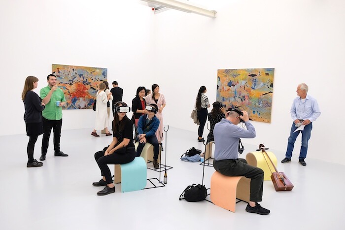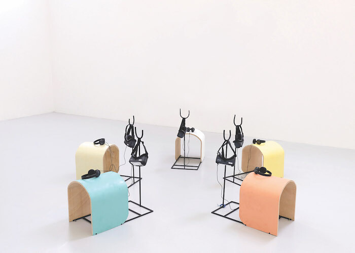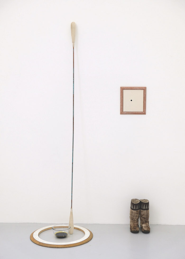 Dolgor Ser-Od and Marc Schmitz’s assemblage North of the North Pole (in memory of Rasmussen) (2018) is housed in Andrew Gillespie’s roaming project Nomadic Vitrine (2016–ongoing), a display case that travels between venues, featuring different artists’ work each time. Ser-Od and Schmitz’s chosen found objects, which are displayed like museum specimens, include 24k plated copper, bronze, gold rocks, iodine, drawings, and various objects such as a cracked iPhone, a pair of boots, and two large calligraphic brushes. It’s a riff on colonial discovery (and extraction) that is also suggestive of a fantasy of elsewhere—north of the North Pole. The ideas of reciprocity and exchange integral to sharing across disciplines and borders, meanwhile, are encapsulated by Deborah Tchoudjinoff’s Baigala (2018). Comprising five VR headsets connected to saddle-like stools, the work immerses viewers in scenes of everyday life in western Mongolia, such as sitting drinking tea in a yurt. Regardless of how oblique the anthropological research can feel in relation to other works in the exhibition, Baigala transmits a direct line to a community of people who are often silenced or repressed by their country, allowing the images to speak for themselves, and encouraging viewers to observe, study, and imagine.