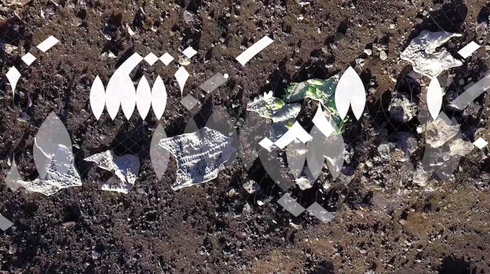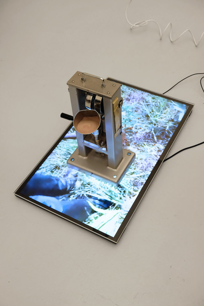 Tuguldur Yondonjamts’s digital print on mylar, 78-291, 875-953, 3006-3106 (Mirror Princess) (2018), which resembles an enlarged roll of analogue film, explores notions of mapping. The work was inspired by the artist’s collaboration with anthropologist Rebekah Plueckhahn, in which they walked throughout Zuun Ail, an area in Ulaanbaatar that is being swiftly redeveloped. Yondonjamts also has shares in the Tavan Tolgoi mine, demonstrating his involvement in repurposing the complicated economy latent within the mineral resources, and coal pigment is used in the print. Thinking about alternative modes of cartography, Yondonjamts explores three parts of a “Khan Kharangue,” a Mongolian poem and singing ritual whose title could be translated as “Darkest Dark,” transposed into the binary music of the morin khuur string instrument. Yuri Pattison’s pick, press, fang feng (the new economy) (2018) also takes an emblematic object of Mongolia as its starting point: the medicinal root Fang Feng. An LCD video monitor laid flat on the floor shows fuzzy footage of undergrowth and foliage with a pill press—frozen in motion, with crushed powder and scattered tablets spilling out—standing on its screen. Fang Feng is traded to China and sold internationally as a Western pharmaceutical product, one of many legal and illegal commodities being extracted from Mongolia to alleviate its debt.