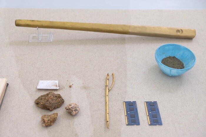 “Five Heads (Tavan Tolgoi)” emerged from an ongoing, five-year research project led by anthropologist Rebecca Empson in the Department of Anthropology at University College London (UCL). As part of the research, five artists and artist collectives were paired with five anthropologists—all of whom are carrying out fieldwork in Mongolia on its volatile economy and vast mineral reserves—to conceptualize and critically engage with the possibilities of financial and political crisis. The Tavan Tolgoi that lends the exhibition its title is Mongolia’s most significant coalfield; the “five heads” are five mineral-rich mounds. A book published by Sternberg Press documents the exchange process between the artists and anthropologists in more detail, offering critical and theoretical essays on aesthetics of estrangement, geo-ontology, speculative post-capitalist futures, and alternative strategies for survival. Although not a prerequisite—the exhibition is rigorous and intriguing—viewers would need to read these essays to understand the full depth and range of the research involved in the UCL project, which is only obliquely touched upon in the art itself.