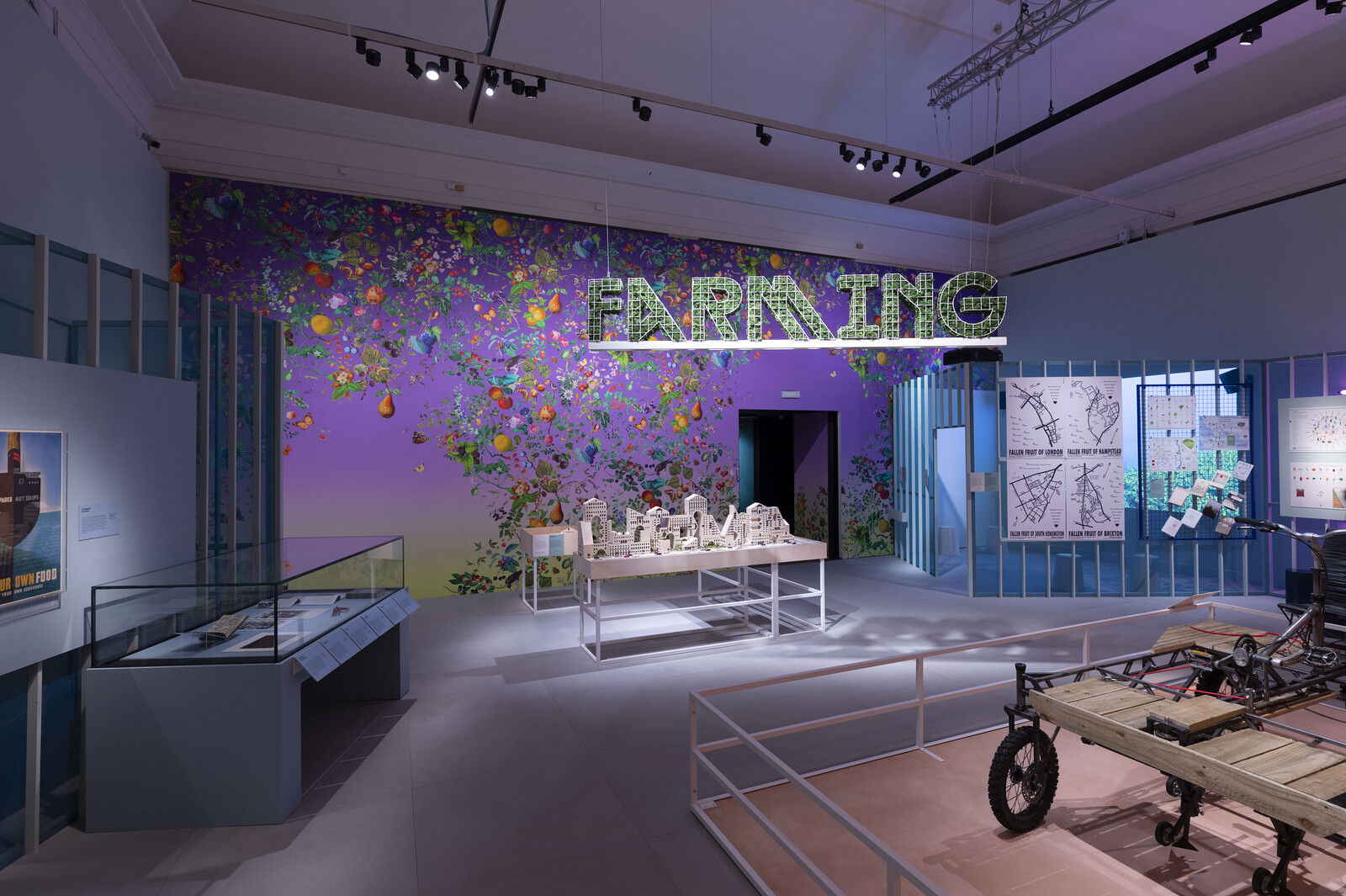To start, the appetizer is an assortment of the types of descriptions and phrases we use to talk about food, seasoned heavily with useless generalizations and limp truisms: we all eat; food connects us; food is more than just food; and so on. Such language dots the exhibition, presented on a bed of colorful, hyper-designed alcoves and panels, as we are led on a sumptuous journey through sections titled “Composting,” “Farming,” “Trading,” and “Eating.”