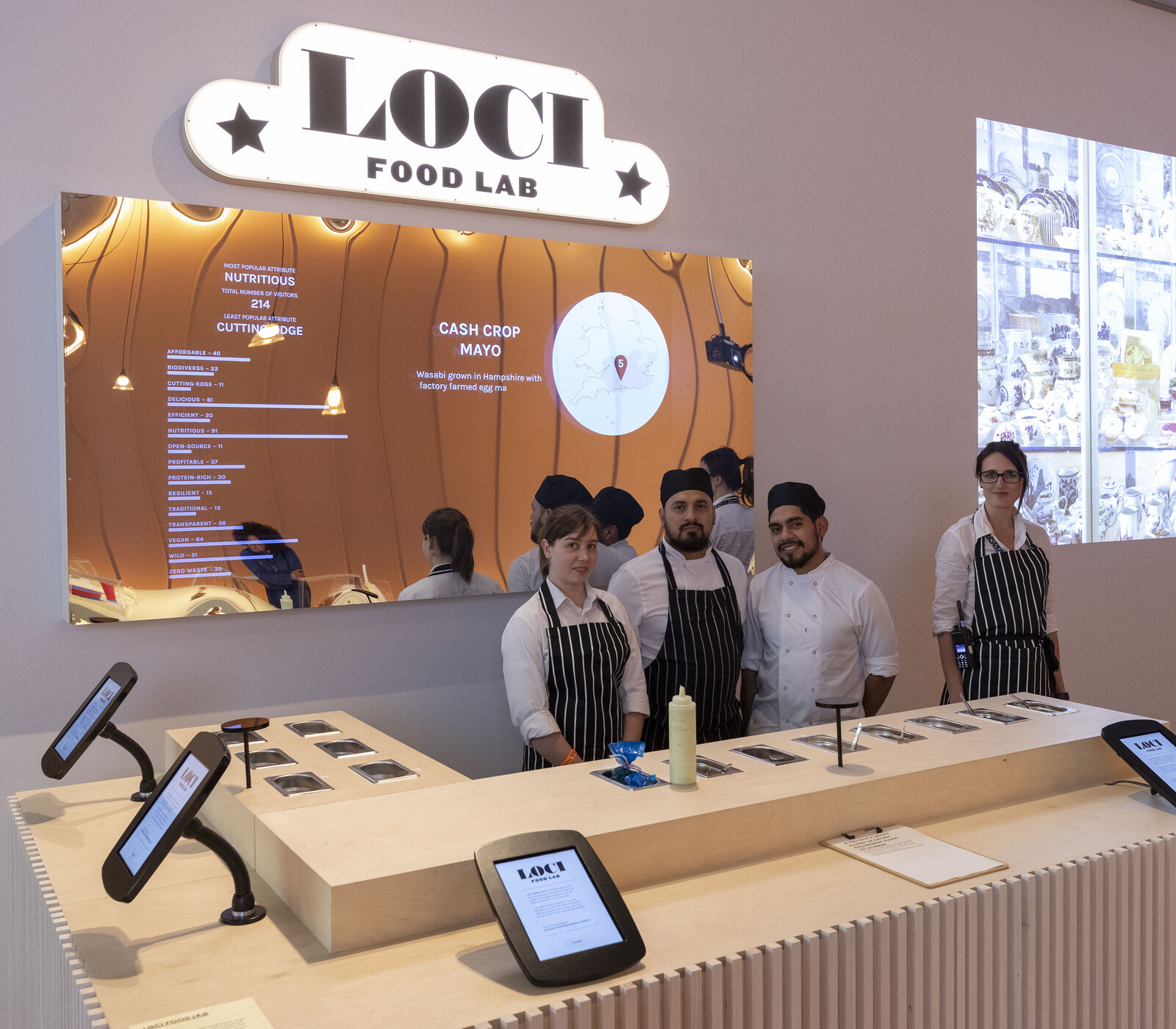 The last course on the menu is a morsel that you can actually eat, from a slick food counter set up by the LOCI Food Lab. If you enter your choices of qualities (traditional, affordable, efficient, etc.) that “a great food system should be,” you’ll be given a thumbnail-sized snack assembled based on your answer. I submitted “biodiverse, nutritious, and resilient,” and got back a chewy bit of sheep’s cheese on a dense cracker, its flavors meant to encapsulate the beech forests of the English Lowlands. What strikes me isn’t so much the attempt to use food as a way to anchor the body (whether as “local” or as an “authentic” food from a particular place), but more how this reflects a wider circular issue in the show, and often food in general: how we are prepped, or prep ourselves, for an experience, looking out for delight or disgust, and then finding exactly what we were looking for. The “Food” exhibition is heavily peppered with exotica intended to weird out tame urbanites, like the bisected plastic sphere, filled with dots and squiggles meant to model as an insect pate, oyster mushrooms grown on sacks of the V&A café’s coffee grinds, and cowpat terracotta pottery. Correspondingly, reviews of the show in the broadsheets use words like “bonkers” and “wacky,” and viewers might leave the museum feeling everything humans produce and consume around food seems zany and oddly upbeat.