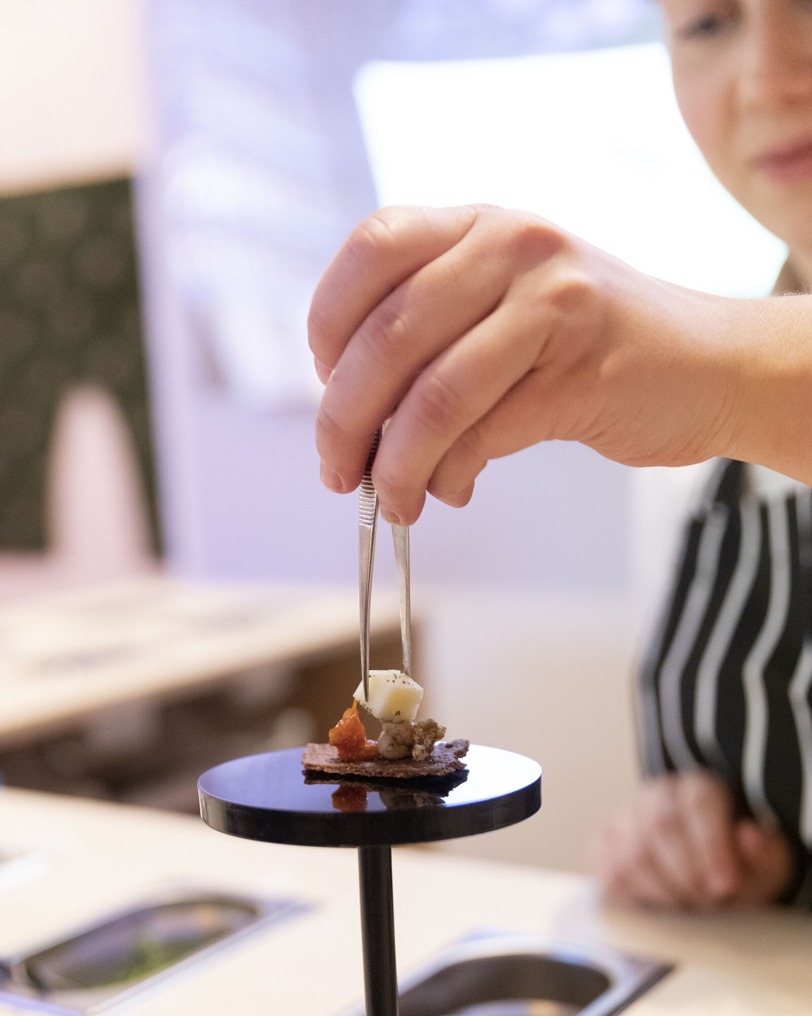Our main courses are presented as a series of altars, spot-lit objects placed on pedestals, most often accompanied by a video of the people who made what sits in front of us, and some context as to why they made it. The first course is a pair of plastic toilets sitting side by side. We are apparently not intended to use them, but instead appreciate the plastic bag that lines the bowl. Loowatt’s waterless toilet, designed as a means to manage waste cleanly in areas without plumbed sewage, raises several themes that return throughout the meal: the objects in this exhibition act primarily as proxies, inert representations of an idea-to-be, projected solutions to specific problems within the contemporary food system. But also, that the real shit isn’t here.