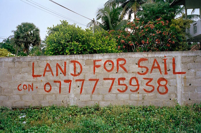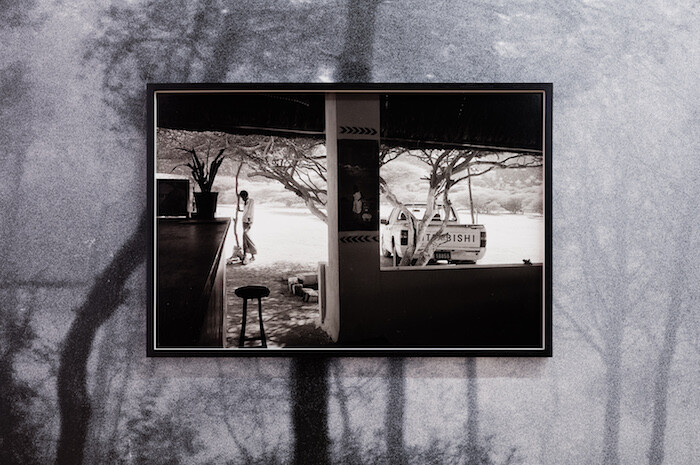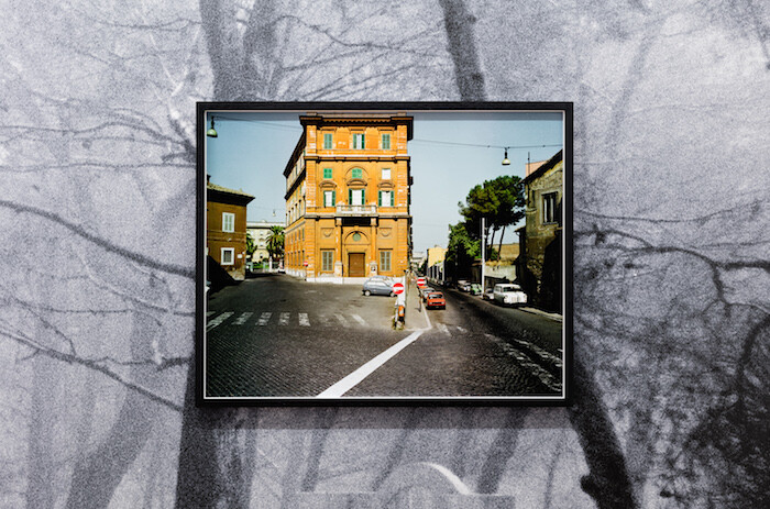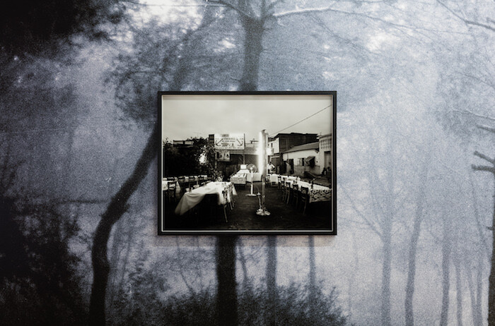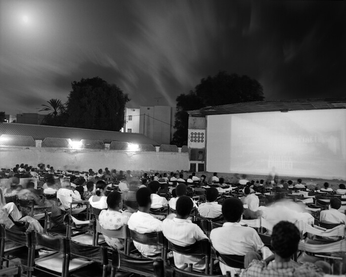 Elkoury depicts Djibouti, Rome, and Cairo like Eugène Atget’s ghostly and vacant streets. The spectral quality, achieved by Atget with the use of long exposure, is manifest in Elkoury’s extraordinary image of an open air cinema in Djibouti. Odeon (1987) depicts the backs of a seated audience, who have remained stationary enough to be captured, while the screen that they gaze towards is overexposed into a white haze. It is an image that records the passage of time itself, emptied of the particular narrative that has captivated the audience. The analog magic of these images has also become, over time, marked as historic: the cinema has since been digitized, migrated to laptops and smartphones. In this exhibition, Elkoury embraces this digitization in subtle ways. The images here are all inkjet prints, and the wallpaper is also the product of digital technologies. Propped on the floor against another wall is an array of framed photographs, as if recently plucked from Elkoury’s archive—more street scenes, another café, and a color photograph of a block wall with the text “Land for Sail” scrawled on it in red paint. Moreover, the images are regularly changed and rotated, suggesting the vast supply and lossless reproducibility of a database.