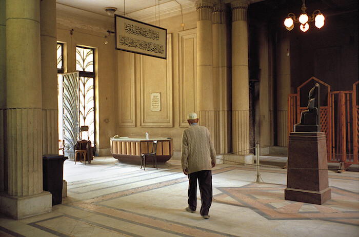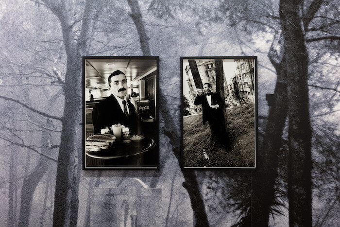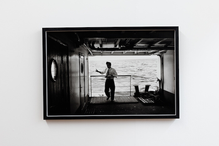 Three photographs hang on the wall, overlapping the wallpaper like a collage: a bar in Djibouti (Bar à sieste, 1987), a street in Rome (San Giovanni in Laterano, 1987), a man sloping off towards a doorway in a Cairo museum (The museum guard, 2012). The images suggest other overlapping historical and political narratives: the Djibouti image was taken before the armed conflict of the early 1990s; the street in Rome is right next to the heart of the Catholic religion; the Cairo image was taken a year after the Arab Spring. Again, however, the affect is paramount. Each location is nearly empty, with a solitary figure, perhaps, adding to the sense of fragility and isolation. In One moment please (2000), a waiter onboard a ferry in Istanbul gestures with his forefinger to an unseen customer—like the subject of a Caspar David Friedrich, he battles the elements, the sea wind tousles his hair, billowing his white shirt, and threatens to upend his tray of crockery.
