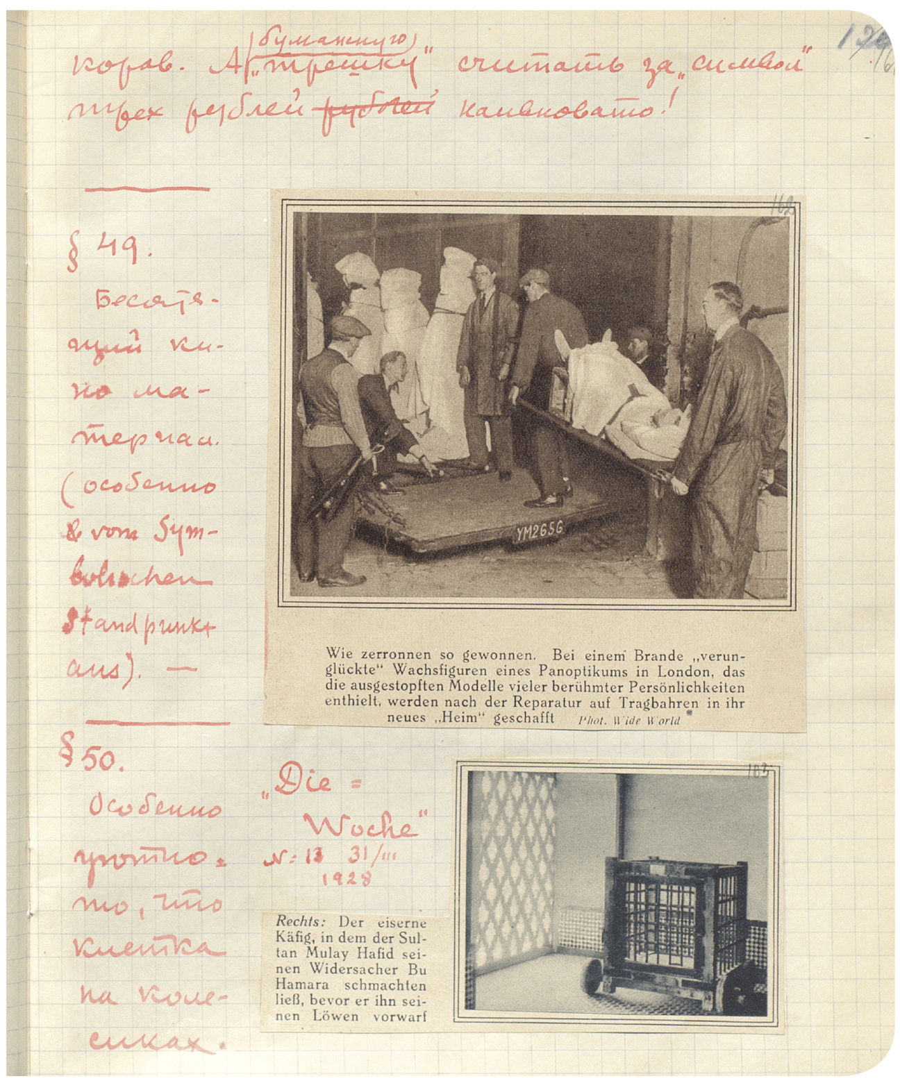 He gave an amusing parallel—how one of us (Shub, me, Pudovkin, Barnet) is resurrecting a mammoth. 3 It’s extremely apt about everyone but me. (See the corresponding page from LEF that should be pasted here). À peu près so: “E[isenstein] is a reconstructor. He orders tusks, vertebrae, etc. made of the best rosewood… . About the irony of the end and as applied to the parts for which there are no archival data.” My way of working is terribly misunderstood. Tret’iakov is too much like a T-square with its screw fastened once and for all. His movement up and down is hopelessly parallel to itself. To analyze October one needs to be an “elastic” French curve like Shklovsky. I “brought to reason” his definition: “Then at the last minute these beautifully made wooden vertebrae are thrown out and replaced with telegraph insulation cups.”4 It’s difficult to define glänzender [more brilliantly] the specificity of our treatment of historical materials and their complete contemporanization by means of impact—that replaces facts according to an associative characteristic—and thereby brings forth a seemingly “resurrected” past, which is at the same time utterly, currently active. (Material for Ausarbeitung [developing] an entire section of theory.) (Nb. In the book it will be necessary to give such a cup en gros plan [in close-up] from a good perspective—as though it were an evidentiary illustration—ha ha ha!). Movement, light, an element of action, a purely optical irritation, etc. One needs to make a montage of two pieces: one, a “skinny person,” the other “a hand.” (The other day Shklovsky reminded me that this was my position —I asked him to write about it somewhere—since I myself couldn’t make it readable.)