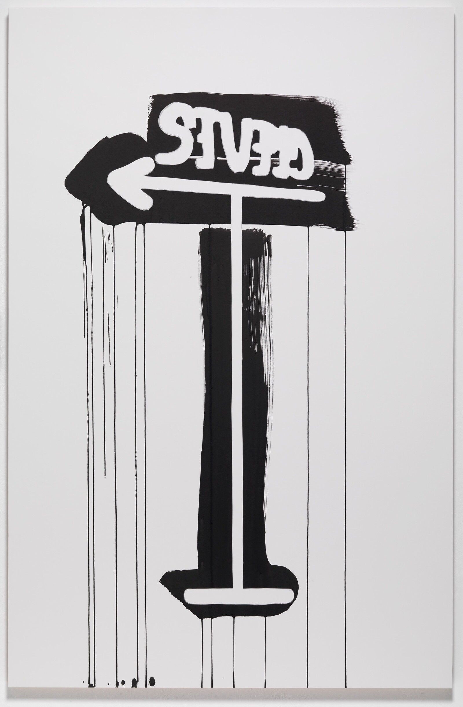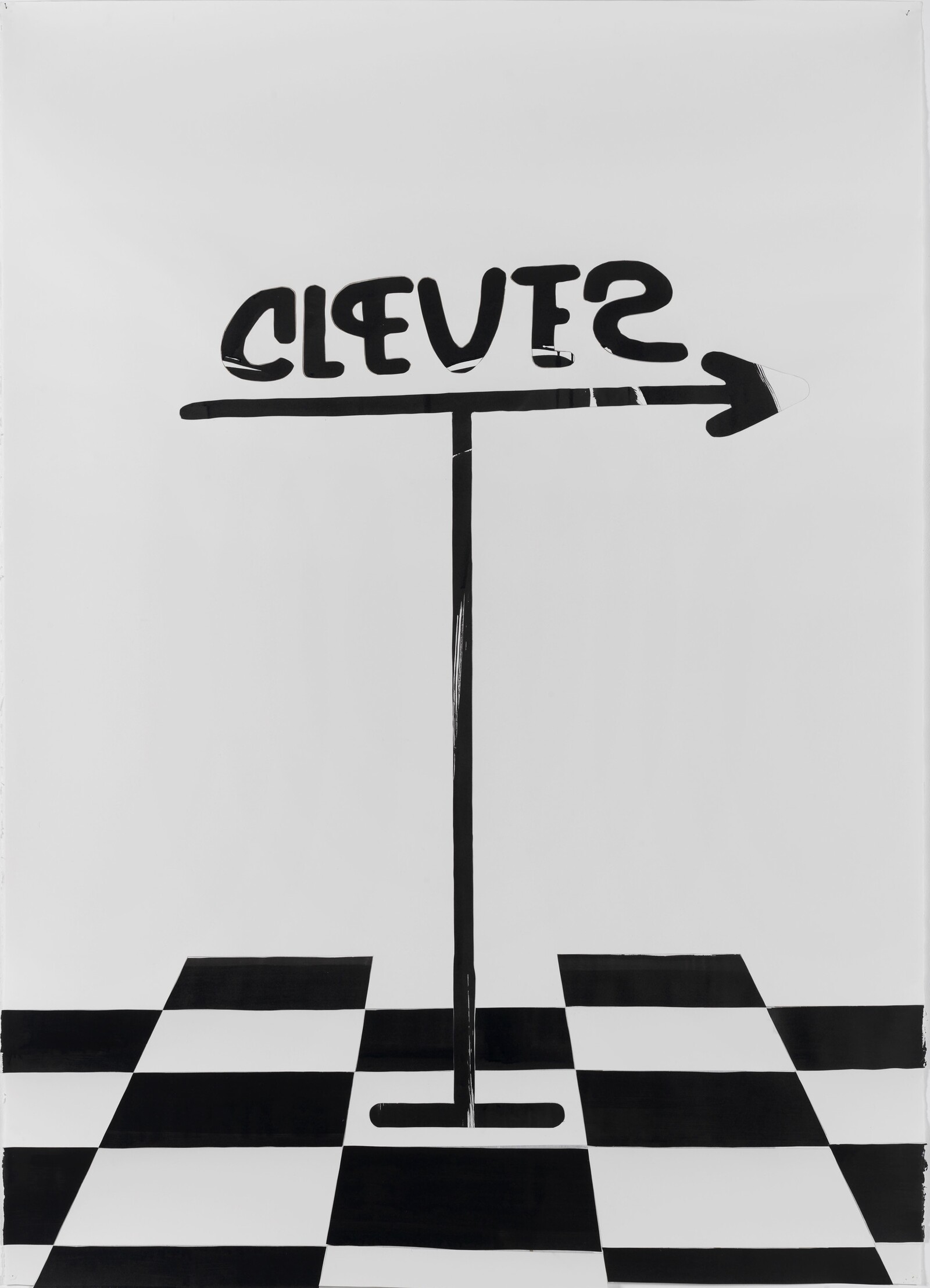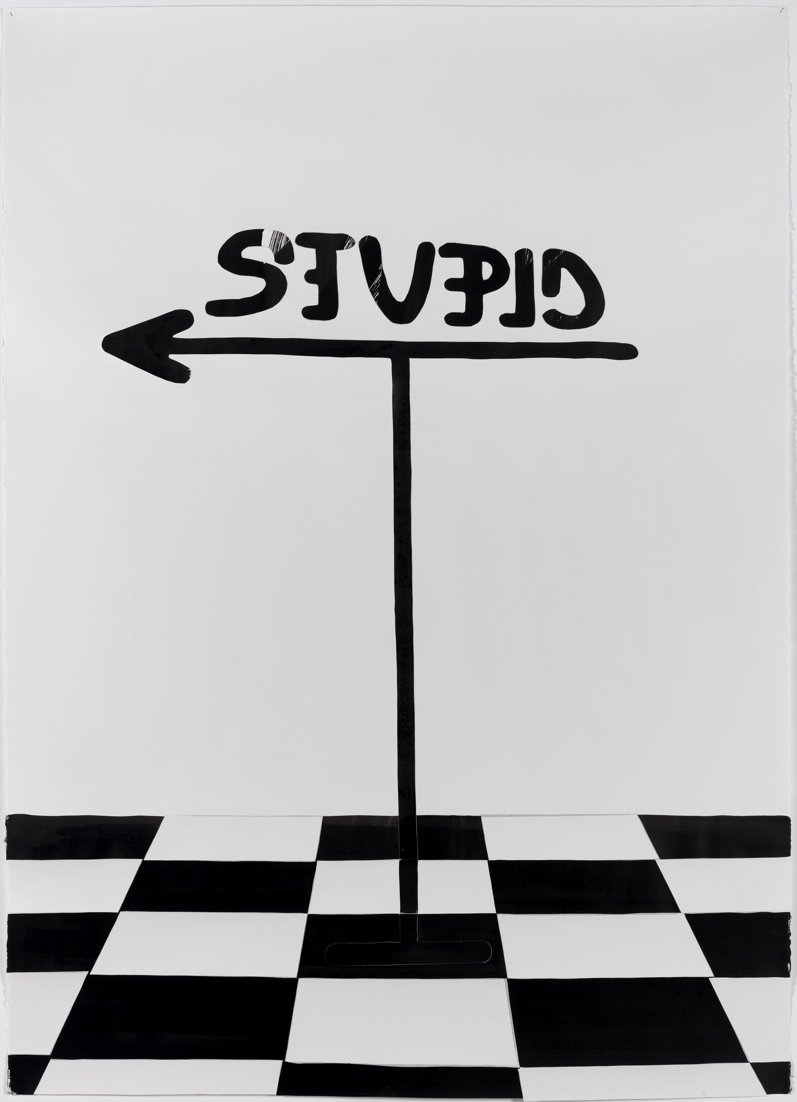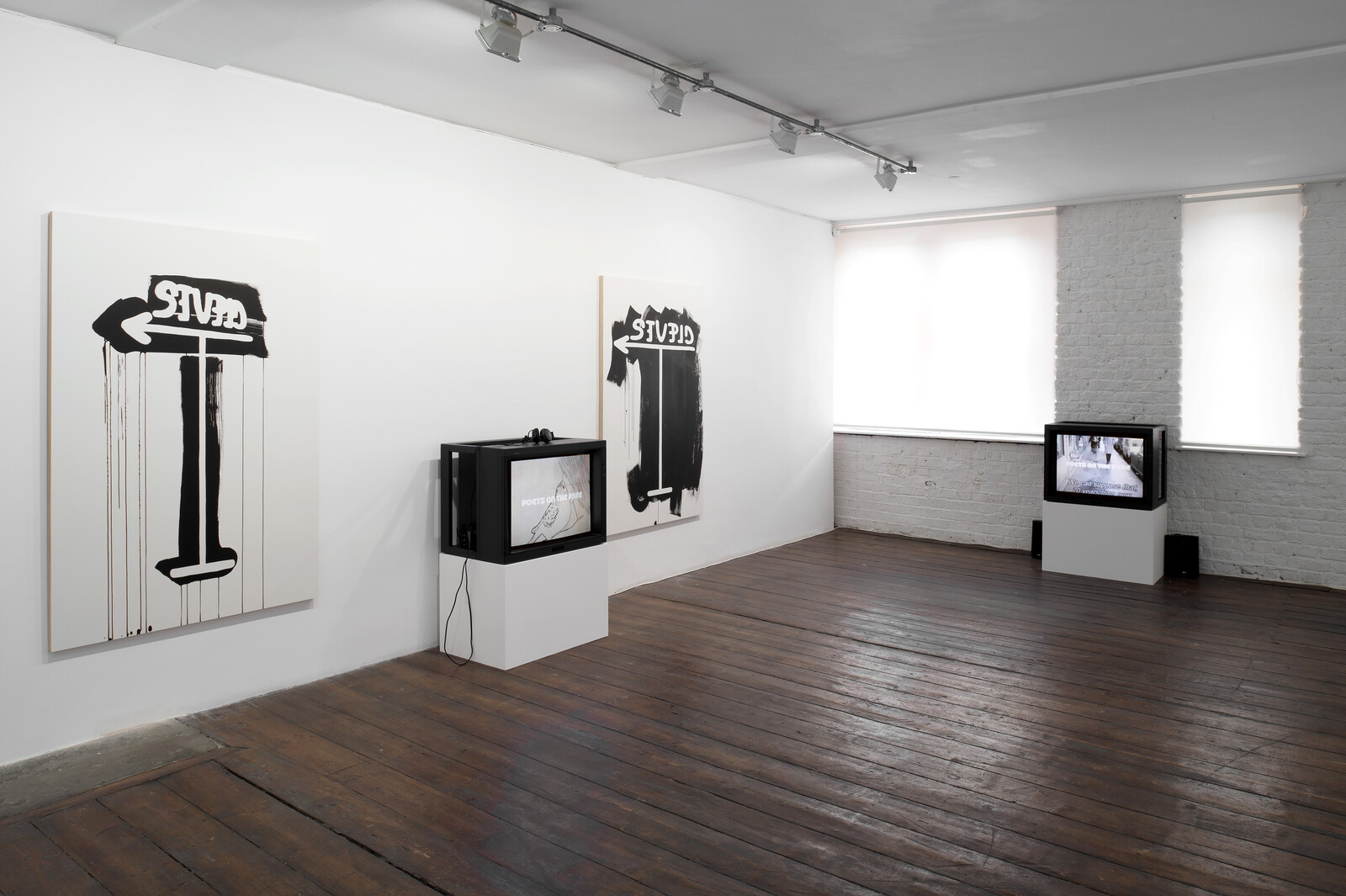 Formally, “Sorry for the Wait” is arranged according to the binary logic of color contrasts, two-tone to be specific. Black ink on white paper is used in the paintings, each with a variation on one form: a signpost composed of three lines and either the word stupid or clever written above it. The form is abstracted in Moment in Clever/Stupid Revolution (2015), rendered positively and negatively against a black or white background in others, and in Stupid Moment in Clever/Stupid Revolution Repurposed (2015) and Clever Moment in Clever/Stupid Revolution Repurposed (2015) it is placed on a black and white checkerboard floor. Echoed by the four black-gray monitors placed against white walls, this two-tone pattern appears again as op-art background in the collage Every other eye in this world is dying to hear (2014), and finally extends, via video works, into the concrete and abstract territory of race—the white against the black body, the hypermasculine “black swag” of rapper Big Sean’s “IDFWU” bouncing off the clean white walls of greengrassi’s antiseptic white space.