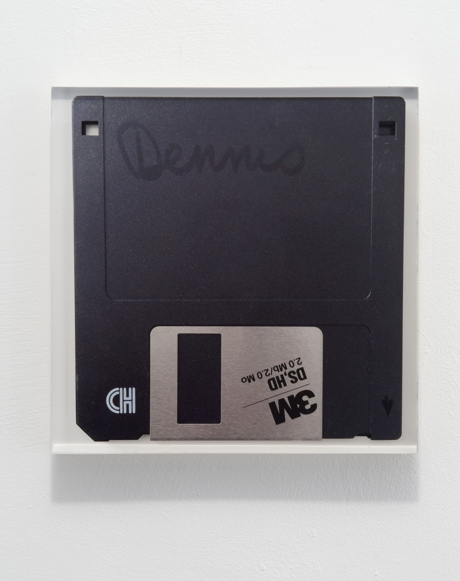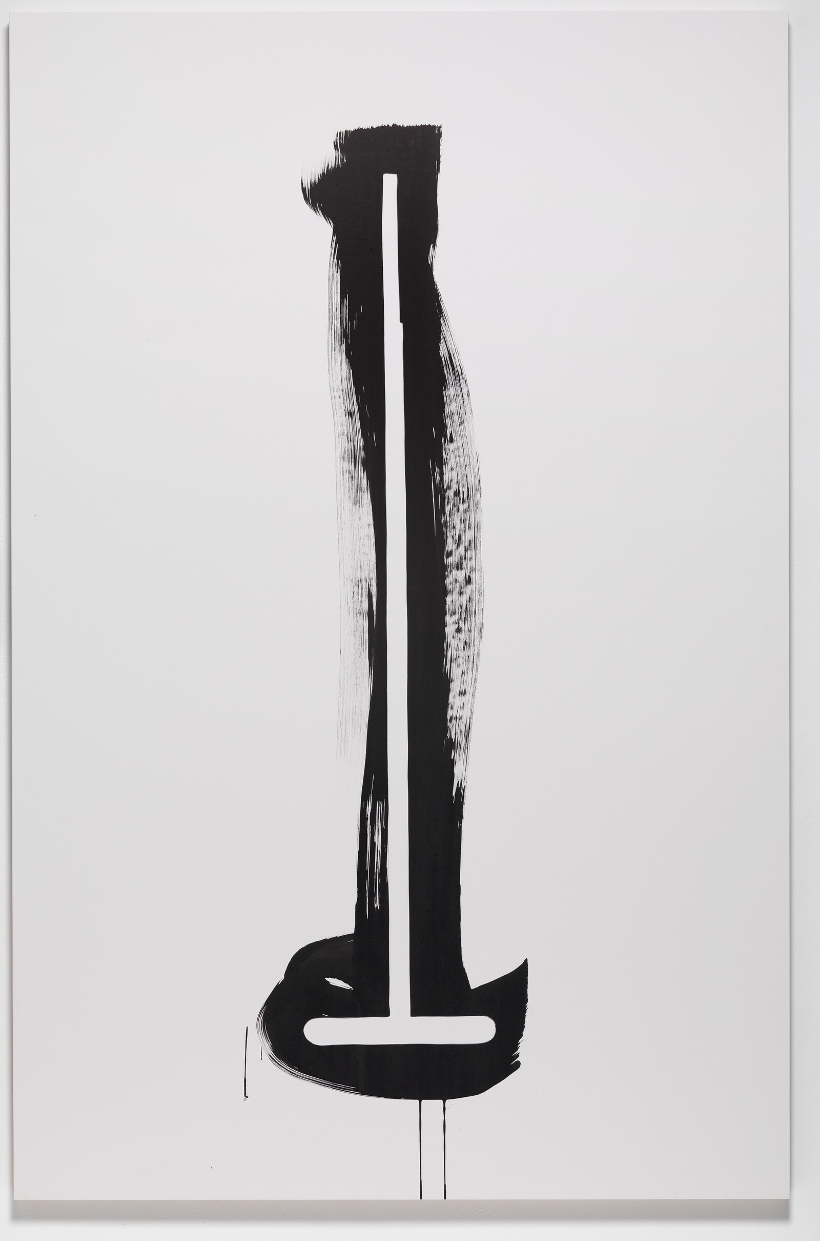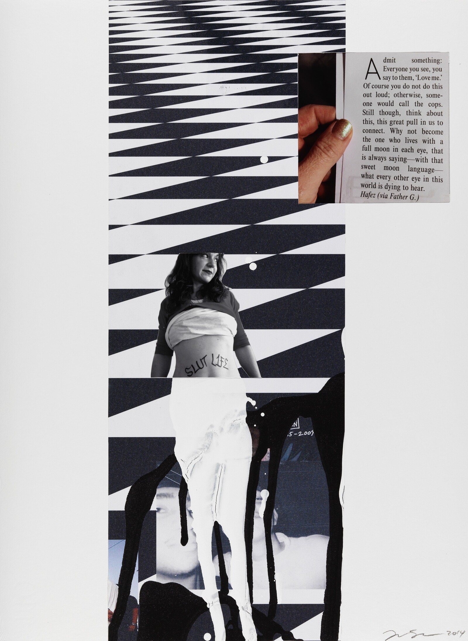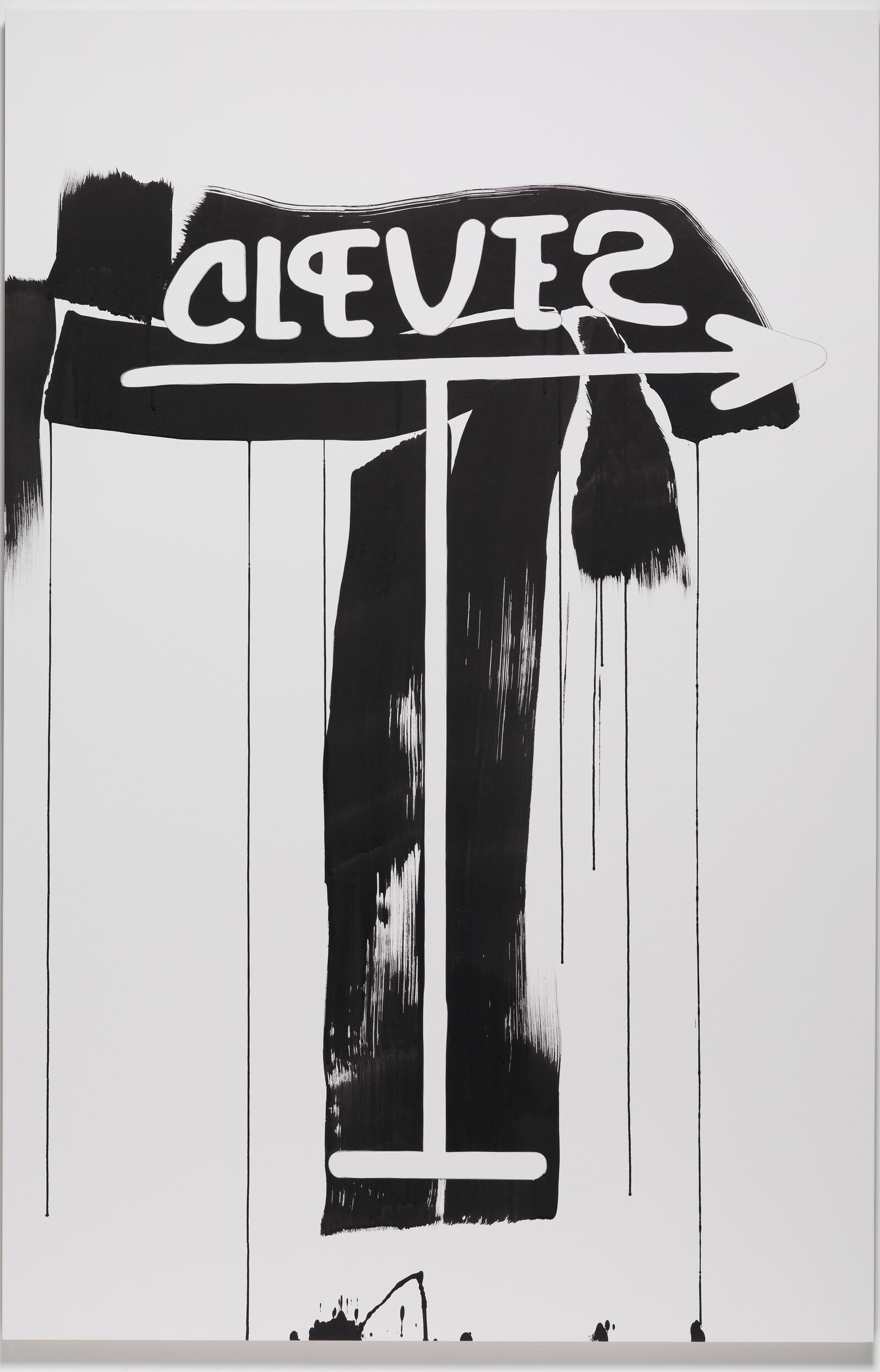Formally, “Sorry for the Wait” is arranged according to the binary logic of color contrasts, two-tone to be specific. Black ink on white paper is used in the paintings, each with a variation on one form: a signpost composed of three lines and either the word stupid or clever written above it. The form is abstracted in Moment in Clever/Stupid Revolution (2015), rendered positively and negatively against a black or white background in others, and in Stupid Moment in Clever/Stupid Revolution Repurposed (2015) and Clever Moment in Clever/Stupid Revolution Repurposed (2015) it is placed on a black and white checkerboard floor. Echoed by the four black-gray monitors placed against white walls, this two-tone pattern appears again as op-art background in the collage Every other eye in this world is dying to hear (2014), and finally extends, via video works, into the concrete and abstract territory of race—the white against the black body, the hypermasculine “black swag” of rapper Big Sean’s “IDFWU” bouncing off the clean white walls of greengrassi’s antiseptic white space.