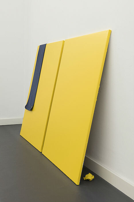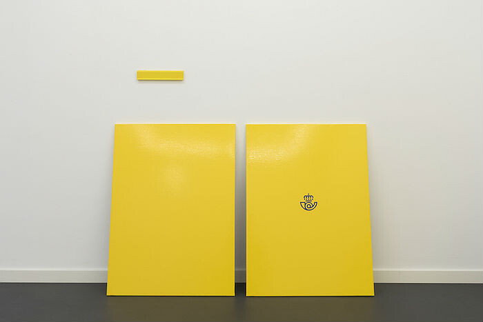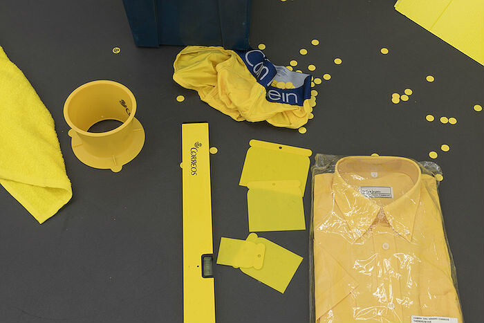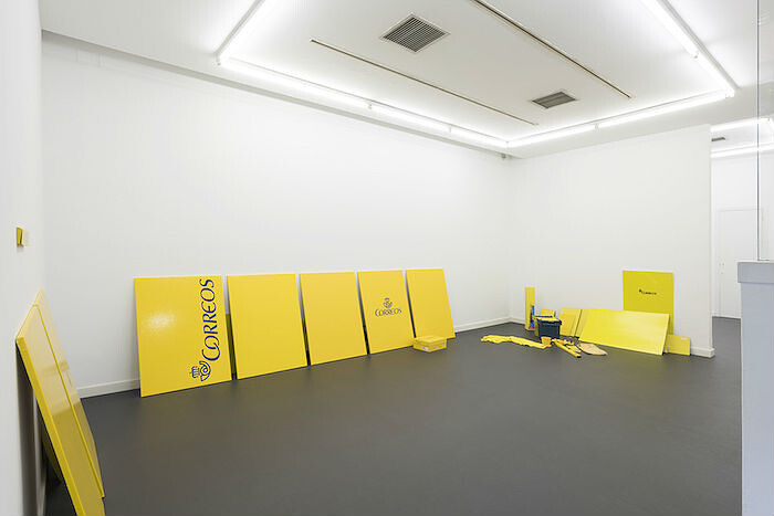 The yellow of the Correos brand is the point for departure for Ruiz’s exhibition. Leaning sparsely against the gallery walls, the canvases that constitute Correos (I–IV) (all works 2015) sport the familiar livery of the Spanish post—from monochromes comprised only of its signature saturated golden color to compositions that incorporate its blue typography or horn-and-crown logo. Divided into four clusters, the paintings are supplemented by installations of branded merchandise, packaging, and other trappings of the postal system. A mailbox fitted to the wall like a portal above a canvas in Correos I (Buzón) [Post office I, (Mailbox)] seemingly turns the gallery into a postal franchise, both a sender and a receiver. Items of official clothing from the staff uniform are wittily incorporated: a scarf casually drapes over one painting (Correos II (Bufanda) [Post Office II (Scarf)]); a tie is carefully folded behind another (Correos III (Caja) [Post Office III (Box)]). Among this merchandised inventory Ruiz also stashes several discarded paper napkins behind the canvases, insinuating possible traces of clandestine sex. It is with Correos IV (Cartón) [Post Office IV (Cardboard)], however, the series’ most theatrically staged work, that its uniformity and minimal look go more wayward. Seemingly in an attempt to test the psychological rationale behind the company’s choice of hue, Ruiz scatters a range of yellowish and more or less plausibly branded items whose colors deviate from the sanctioned corporate tone. A pair of Calvin Klein men’s briefs, a spirit level, plastic spatulas, and a fluffy towel are either just-too-florescent, a little too mustard, or the result of sloppy color matching. New and unannounced postal elements will be progressively incorporated into this ostensibly haphazard cluster of items throughout the exhibition, mirroring Correos’s ceaseless circulation. Yet pointedly, the viewer is left to guess which elements are graphic inconsistencies that exist within the brand and which are mischievous additions of Ruiz’s devising.