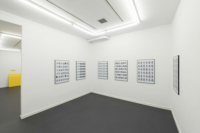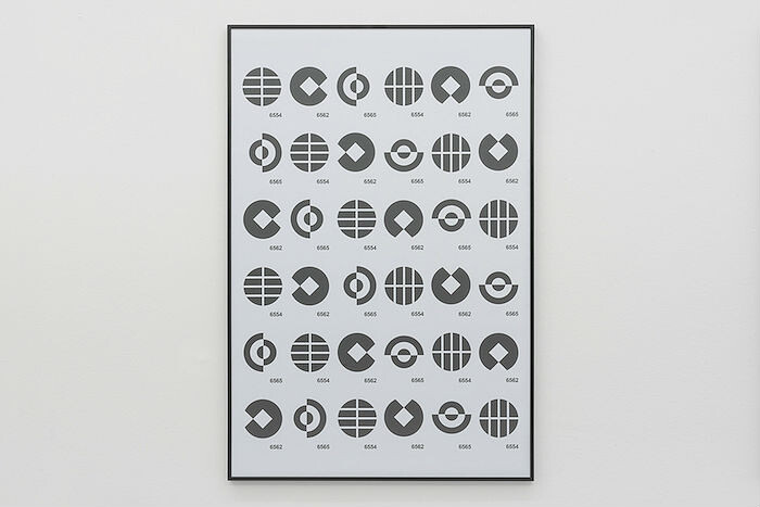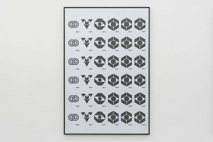 In Marcar [To mark], Ruiz reprises his signature grids printed on paper to delve more comprehensively into Cruz Novillo’s overreaching influence. Here Ruiz connects Cruz Novillo’s economy of form with concerns shared by both the artist and his subject: seriality and permutation. Six black-and-white printed panels repeat and rotate a selection of the many Cruz Novillo-designed logos that still form an integral part of the Spanish graphic landscape. Ruiz’s groupings follow a binary logic: on the one hand, those pertaining to public or private organizations—construction and property developers, communication entities, state-owned companies—are grouped together. On the other hand are those that obey a more humorous raison d’être—exemplifying the playfulness that’s often a feature of Ruiz’s work—for example, logos that appear like cheeky eyes staring out at the viewer. Resembling a visual memory card game of decontextualized shapes, the prints leave one to speculate about the persistence of the logos’ personalities, and how their familiarity has been so assimilated into Spanish civic life.