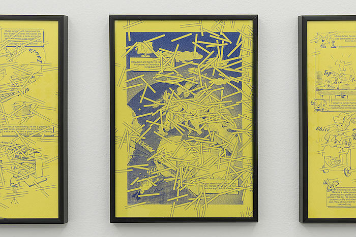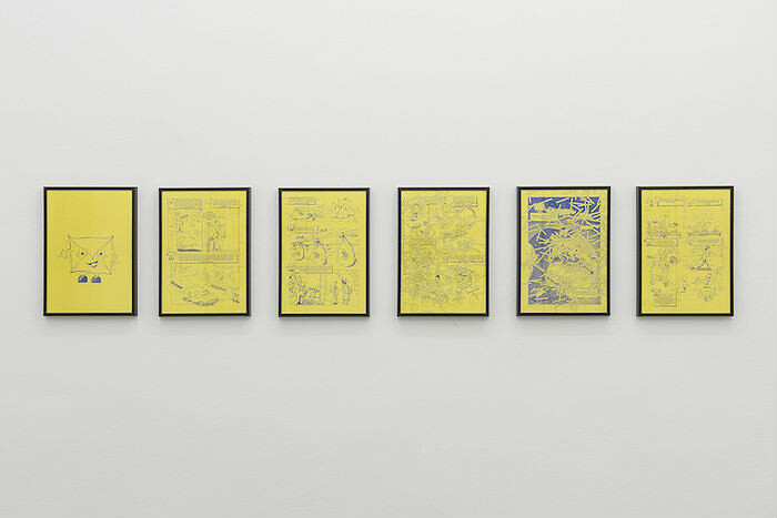 In THE MIDAS TOUCH, Ruiz adapts a 1999 comic book published by Correos narrating the journey of a letter as it travels from sender to recipient into a series of six framed prints on yellow paper. Ruiz supplants the original story with the myth of King Midas, the monarch cursed by his ability to turn everything he touched into gold, including, fatefully, his own daughter. Correos’s low-key public-relations tool becomes, in Ruiz’s hands, a subtle critique of the perils of the free market—the Spanish government’s monopoly on providing postal services was opened up to competition in 2011. Correos is here much more than a case study of a Spanish brand that has seemingly kept its core function intact despite the political changes of the last 40 years. As Ruiz demonstrates, its visual logic seems to betray a degree of inconsistency and doubt as its operations have diversified. Moreover, as it exploits the symbolic connections between the corporate yellow and the value of gold, and the careful-what-you-wish-for moral of the Midas story, Ruiz’s shrewd exhibition astutely addresses the pitfalls of the liberalization of public-sector services.
