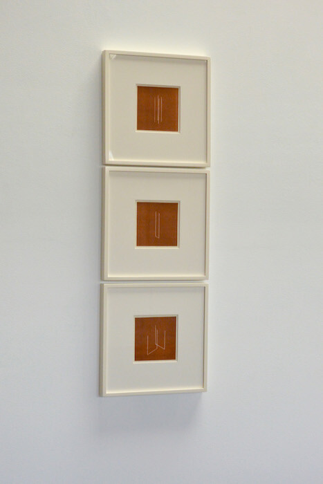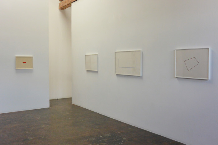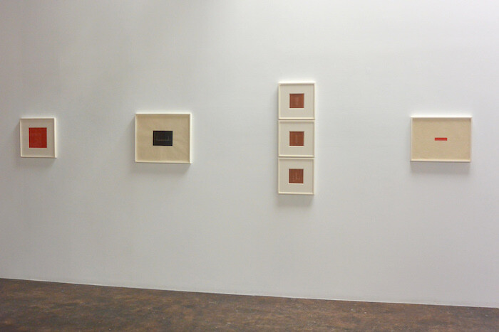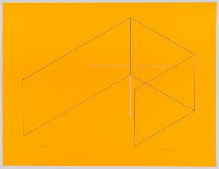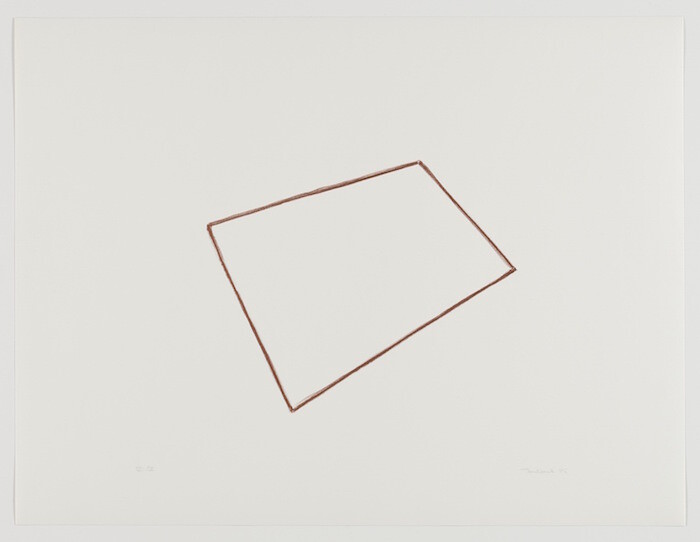 The 11 prints featured in this exhibition—etchings, lithographs, silkscreens, and woodcuts, all untitled and produced in the 1970s—are points of reference for his sculptures, although these are absent. For instance, a red, square-framed lithograph from 1979 shows a sculpture in which a rectangular length of yarn is suspended diagonally between the floor and the wall. Another print, a bright yellow silkscreen from 1970, installed on a table, appears as a translation into paper of Pink Corner Piece (1970), another construction in which two equally sized, stretched elastic cords—one positioned from wall to wall to straddle the corner, and another that delineates the intersection of two walls on the ground—serve as a study for the convergence of sculpture and architecture.
