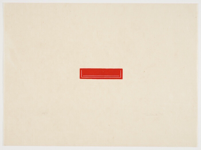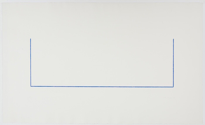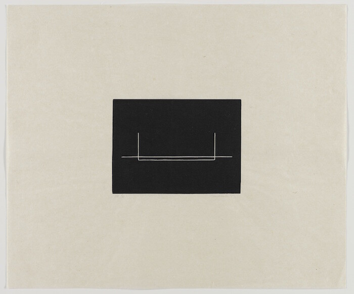 Sandback conceived lines as “a whole, an identity for a particular place and time.”1 For him, line was not a simple explorer of space but an essential creative producer of it. Hence the artist’s band-based constructions were not placed within a space in order to posses it, to take it over, but to coexist and generate dialogue. Sandbank equally demonstrates the multiplicity of space in a black-framed rectangular linocut from 1975, in which a white, U-shaped line is intersected in its lower part by another white line. It is not clear if it is a figure, the ground, a wall, or simply empty space. There is a compelling fluctuation between fact and illusion in this print and those in the show that are similar to it, an engagement with the multidimensional condition of space that highlights shifts in perception as a viewer moves through the gallery.