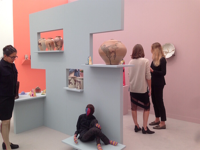 Such fragile balance between compulsion and lucidity can be projected onto Francis Upritchard’s booth at London’s Kate MacGarry. It presents an excellent composition of crafted objects and figures—large terracotta pots with painted ape-like silhouettes; colorful small hats for tiny dropouts; elegant humanoid figures with elongated eyes and impossibly long limbs—carefully arranged against an impeccable candy-colored setting. With its glamorous ethnographic spirit, the display of this miniature exhibition combines the eclectic tradition of the Wunderkammer with the seductive environment of the thrift shop, attesting how the presentation of material culture is never disconnected from the apparatuses for its trade.