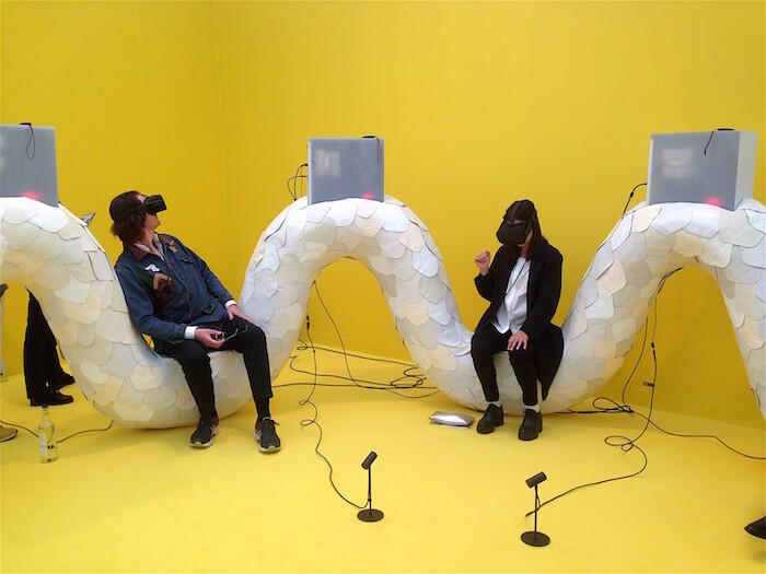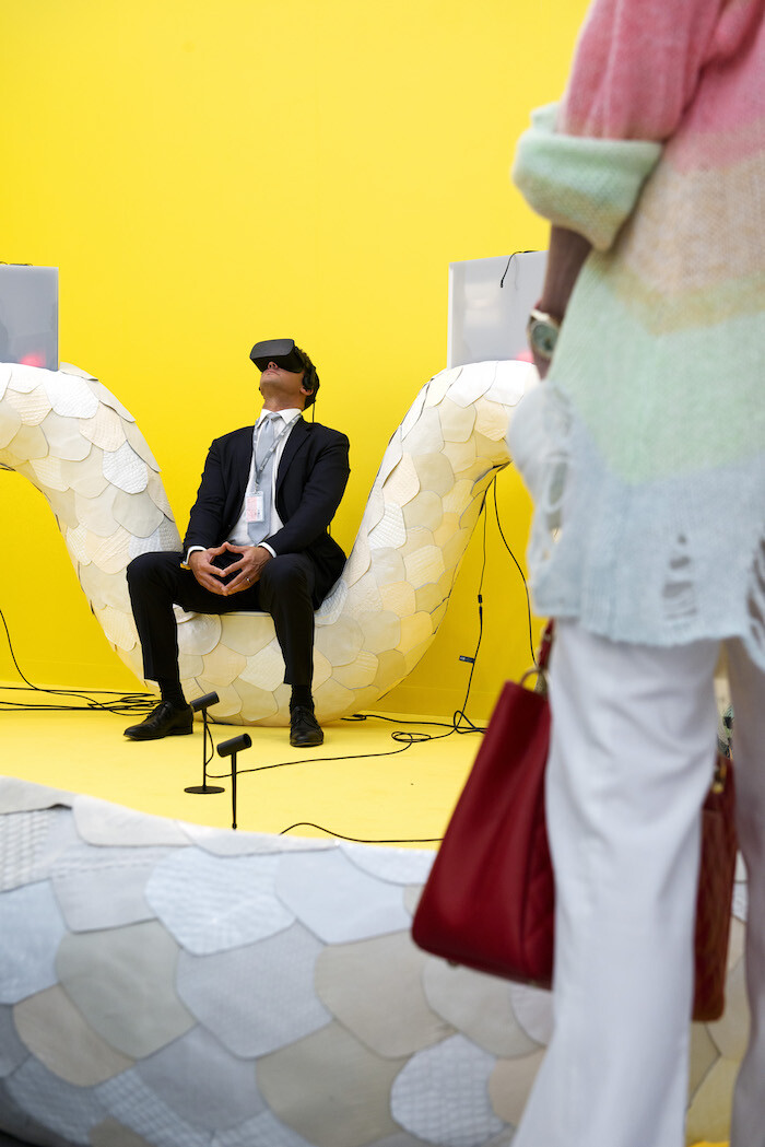 Amid the repetitive plethora of milky booths of the fair, a vivid yellow area, located at the upmost extremity of Frieze’s tent, appears to be almost detached from its surrounding context. To access it, visitors need to ride the sculpture of a large albino ouroboros fitted with several Oculus Rift headsets. Some people are already seated, glasses and earphones on, as vulnerable and careless as trippers on acid. Presented by London’s Seventeen Gallery, Transdimensional Serpent (2016), a sculptural installation and four-minute Oculus Rift experience by Jon Rafman, is one of the most complex, generous, and alluring works on view. Its video places viewers in a supernatural environment where dodgy alleys, warm deserts, and cold forests are populated by all sorts of fantastic beings. Rafman manages to expand the ubiquitous reflection on the impact of technology on contemporary life (which dominates the practice of so many of his peers) towards a concrete physical experience that propitiates the fulfillment of corporeal pleasure while speculating on other modes of seeing and being. Alienation appears as a powerful antidote to the anxiety and distress that commonly afflict the art fair visitor.