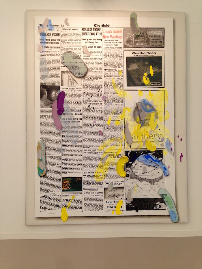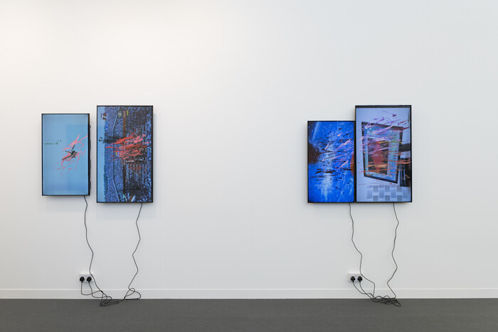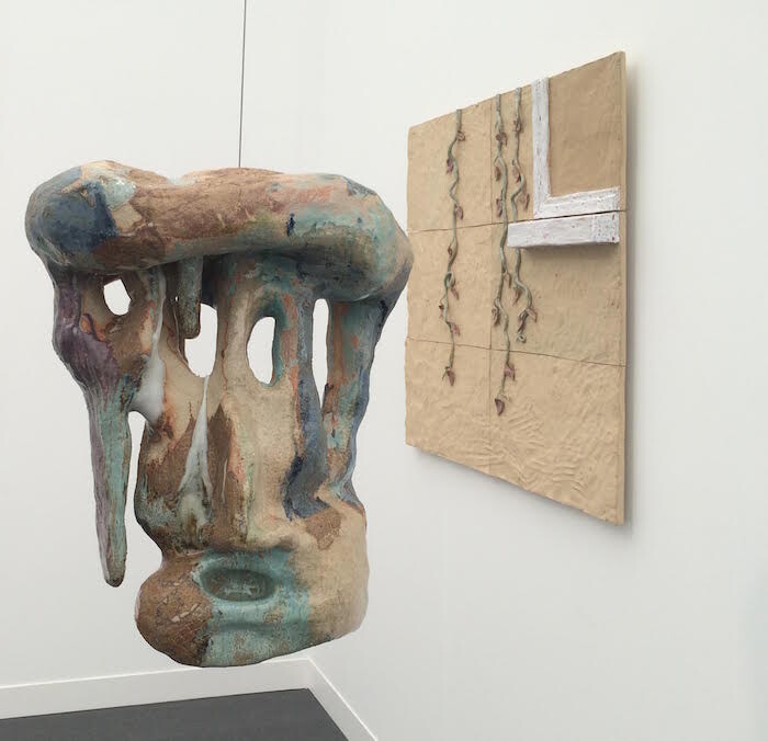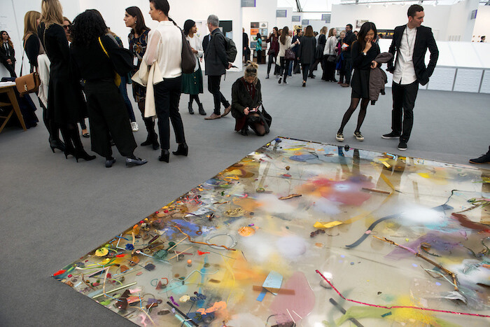 For less established galleries, art fairs can be as much about making an impression as making a sale, and London-based The Sunday Painter—showing at Frieze for the first time—has boldly decided to showcase not just a single artist, but a single artwork. Lonely Planet 2 (2015), by Samara Scott, is a rectangular basin set into the floor and filled with consumer detritus: belts, spring onions, plastic jewelry, strips of tape and foam, pebbles, twigs, ribbons, and plastic cups, all submerged beneath clear water atop which islands of oil, food dye, and spray paint float. This puddle of brightly colored, disposable stuff is—perhaps surprisingly given its ad hoc nature—one of the most visually stimulating pieces in the fair. After 6 p.m., once the complimentary bottles of Pommery champagne start doing the rounds, an assistant erects a metal wire to prevent visitors from staggering into the artwork.